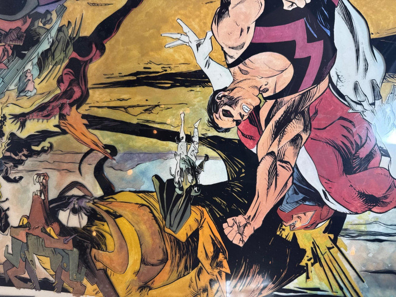 The artwork depicts a large-scale battle involving several prominent Marvel Comics characters. Notable figures in the scene include: Wonder Man (Simon Williams): Positioned centrally in his classic red and black costume, appearing to pull another character toward him. The Fantastic Four: Members such as The Thing, The Human Torch, and Invisible Woman (in her 1990s costume) are visible in the background and foreground. Doctor Doom: His face is prominently featured in the lower right corner, appearing to observe or command the chaos. The Avengers: Various members, including what appears to be Captain America and others, can be seen in the background.
