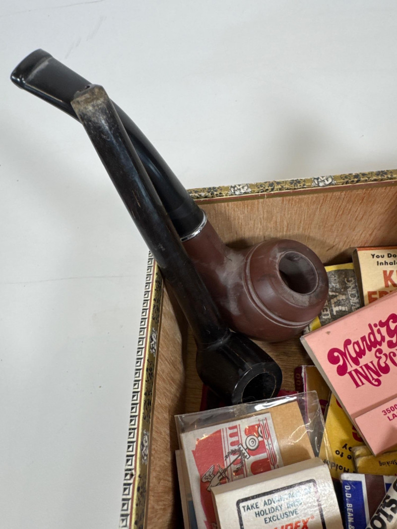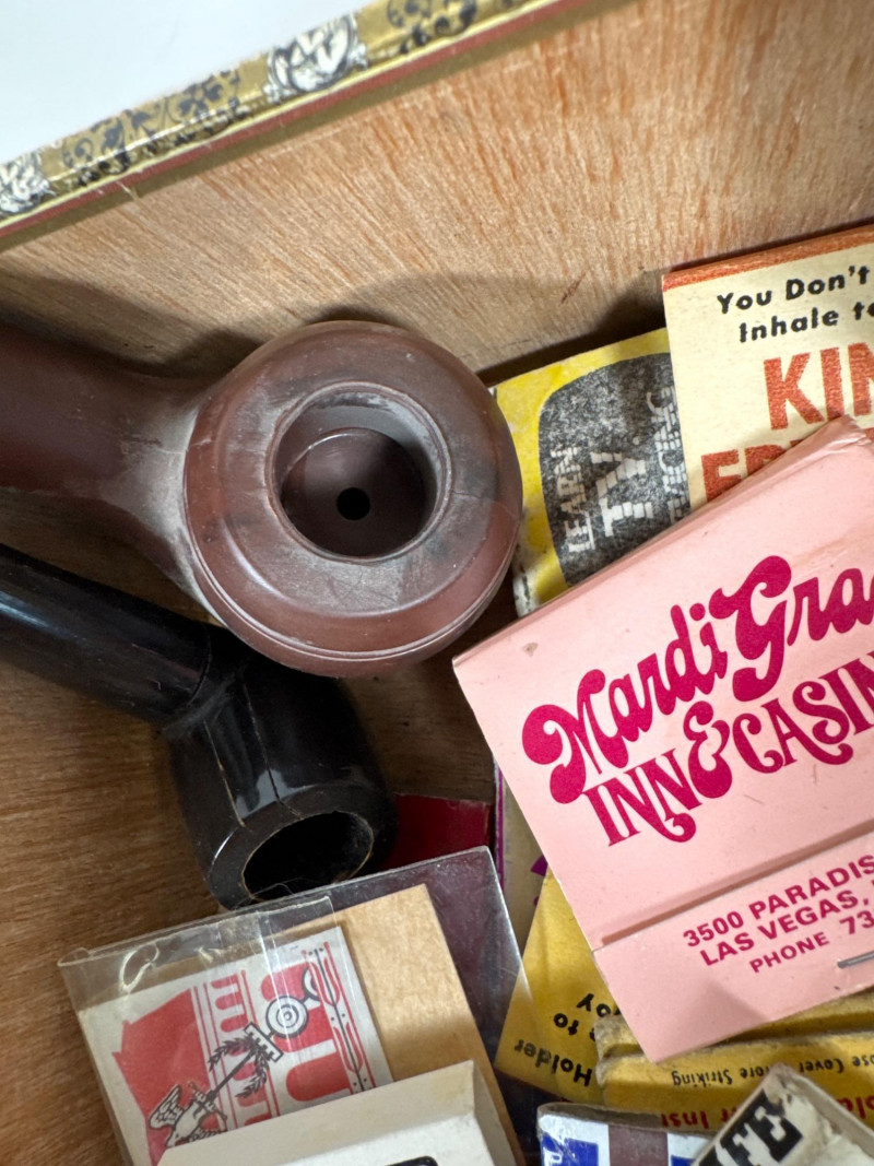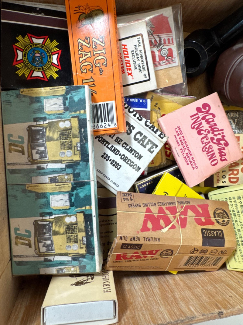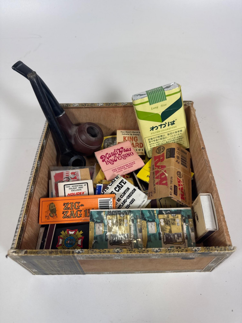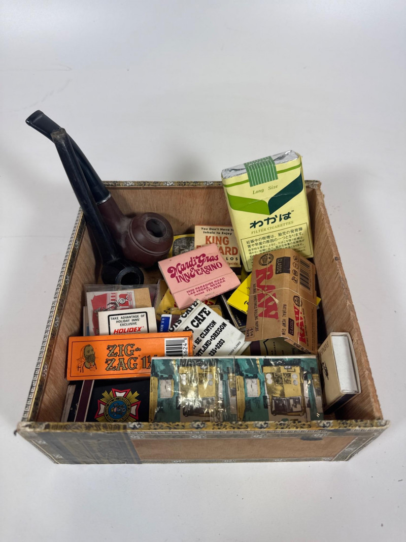 Vintage pipes, matchboxes and rolling papers