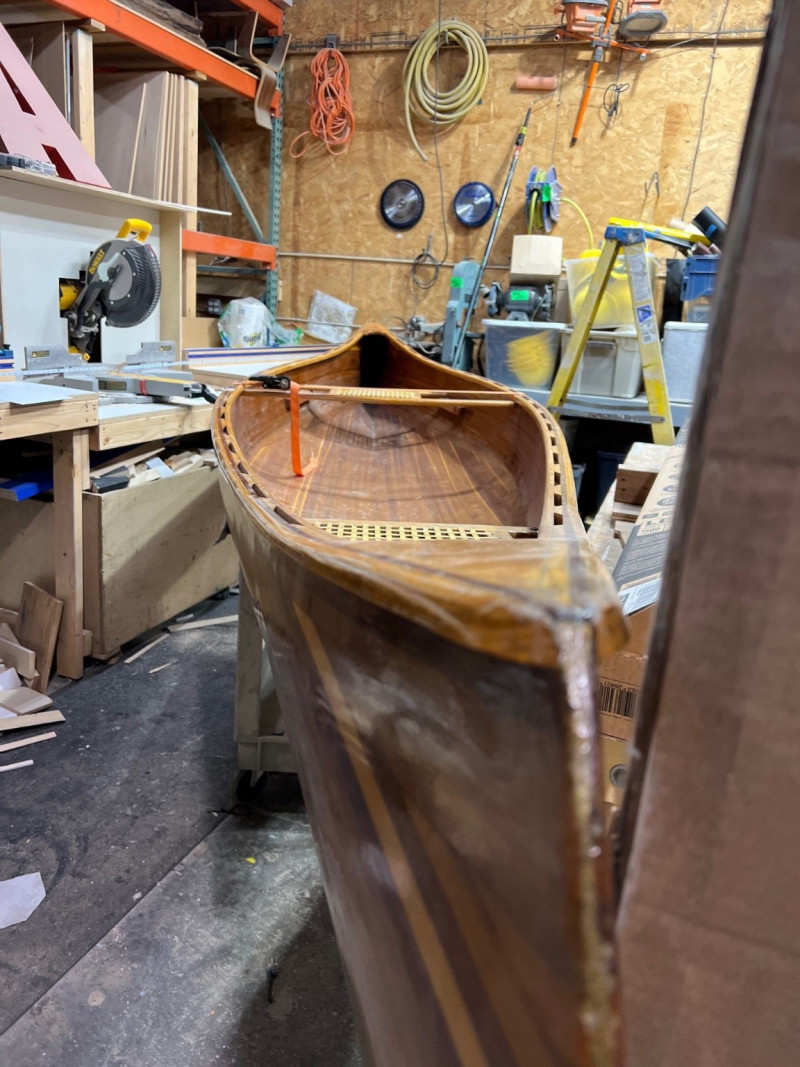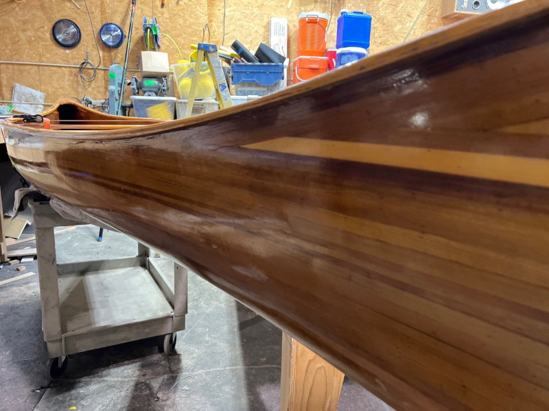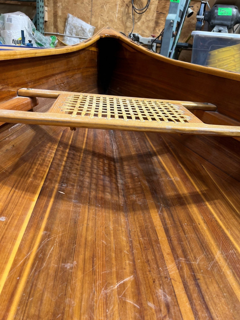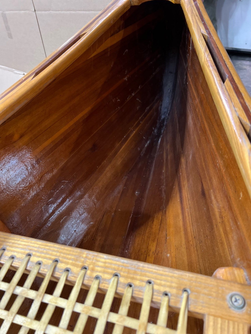 This canoe was hand made in White Salmon, Wa in 19999. It was made from a plan created by Ray Klebba, the owner of the White Salmon Boat Works. The plan was called the Hiawatha. It features thin stripes of western red cedar for the boat and Ash was used for the gunnels and seats. The cedar is coated with fiberglass. It is a show piece that is tough enough to be used regularly. Length: 15.5 feet Beam: 3 feet