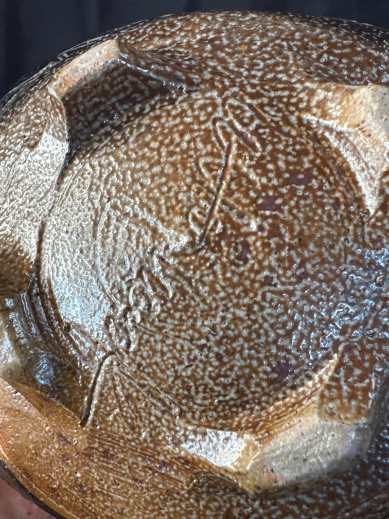 Based on its design characteristics, it features a speckled tan or brown glaze with abstract black brushwork, a style frequently seen in Japanese Shigaraki-ware or Karatsu-ware