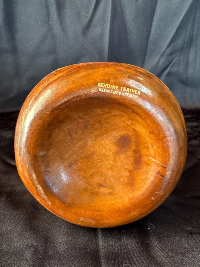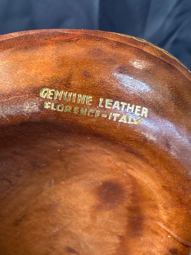 This is a vintage Italian leather-wrapped glass decanter, likely used for wine, whiskey, or other spirits. These pieces are frequently attributed to Mid-Century Modern (MCM) barware, often originating from Italy, specifically areas like Florence.