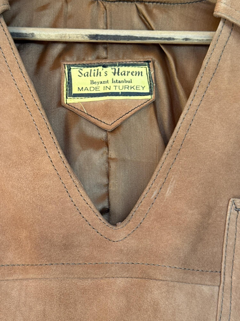 This garment is a vintage suede leather pullover shirt manufactured in Turkey. Based on its styling and the label design, it likely dates from the 1960s to the 1970s.