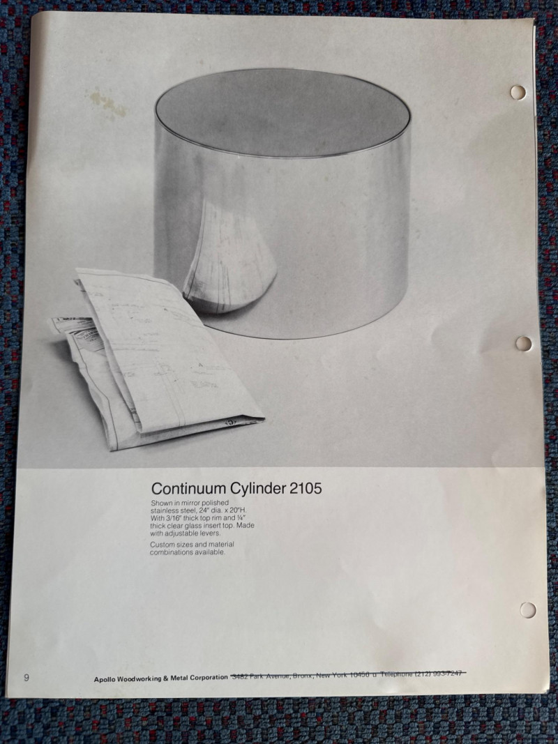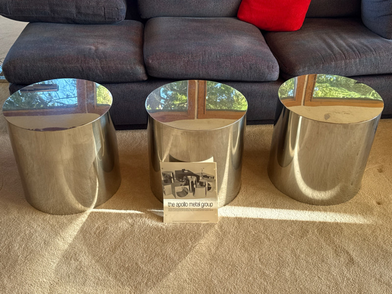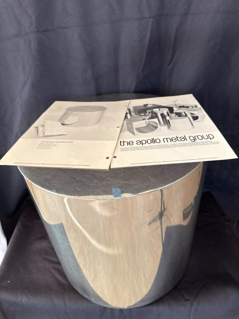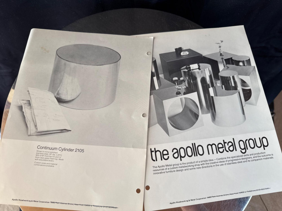 The Apollo Metal Group was a specialized manufacturer of stainless steel furniture, and pieces accompanied by original documentation (like the brochure shown) are more desirable to collectors. Pieces from this specific manufacturer are recognized for their high-quality stainless steel construction. Having the original brochure (as seen in the image) provides crucial provenance, which can increase the value by 20% or more for serious collectors.
