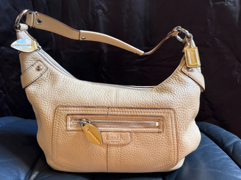 This handbag is the Coach Penelope Pebbled Leather Hobo, a classic style known for its elegant crescent shape and practical front zipper pocket.
