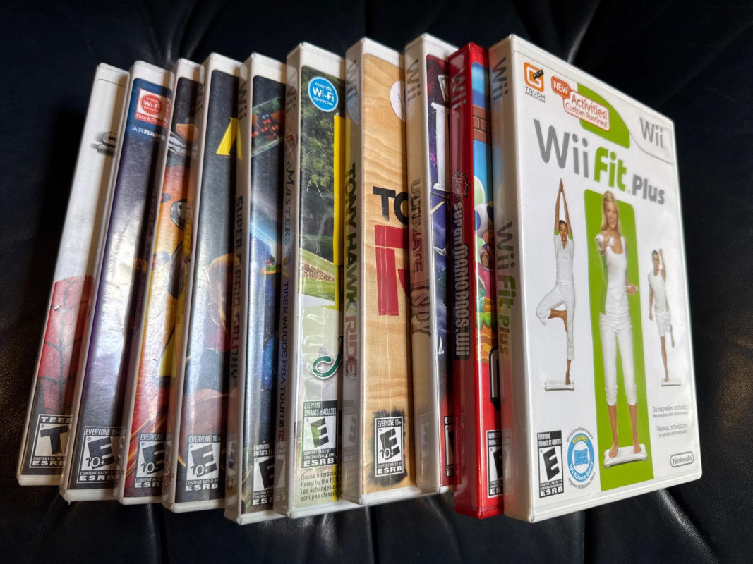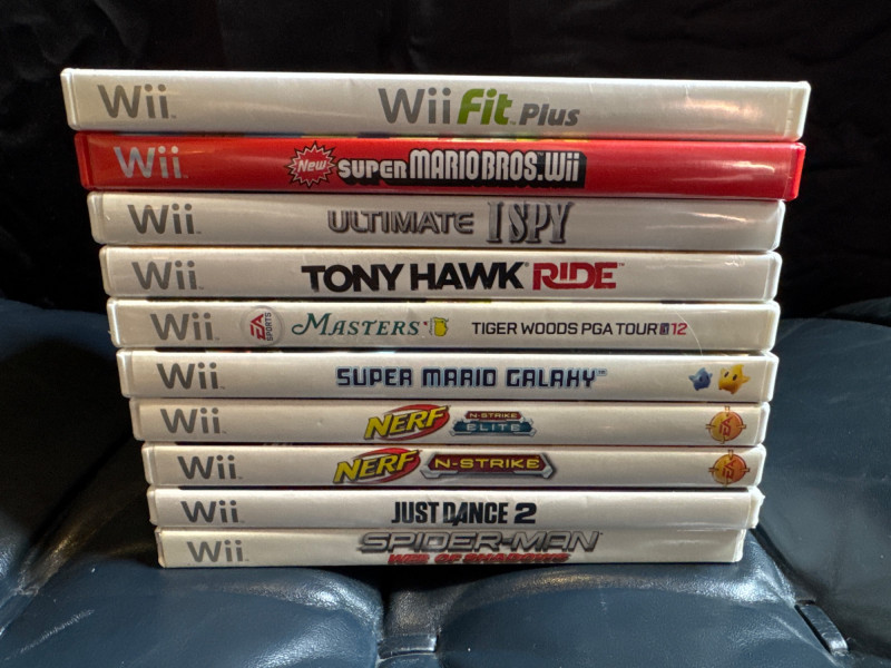 All have discs and appear in good condition. New Super Mario Bros. Super Mario Galaxy Spider-Man: Web of Shadows Tiger Woods PGA Tour 12: The Masters Wii Fit Plus Just Dance 2 Ultimate I Spy Nerf N-Strike N-Strike Elite Tony Hawk Ride