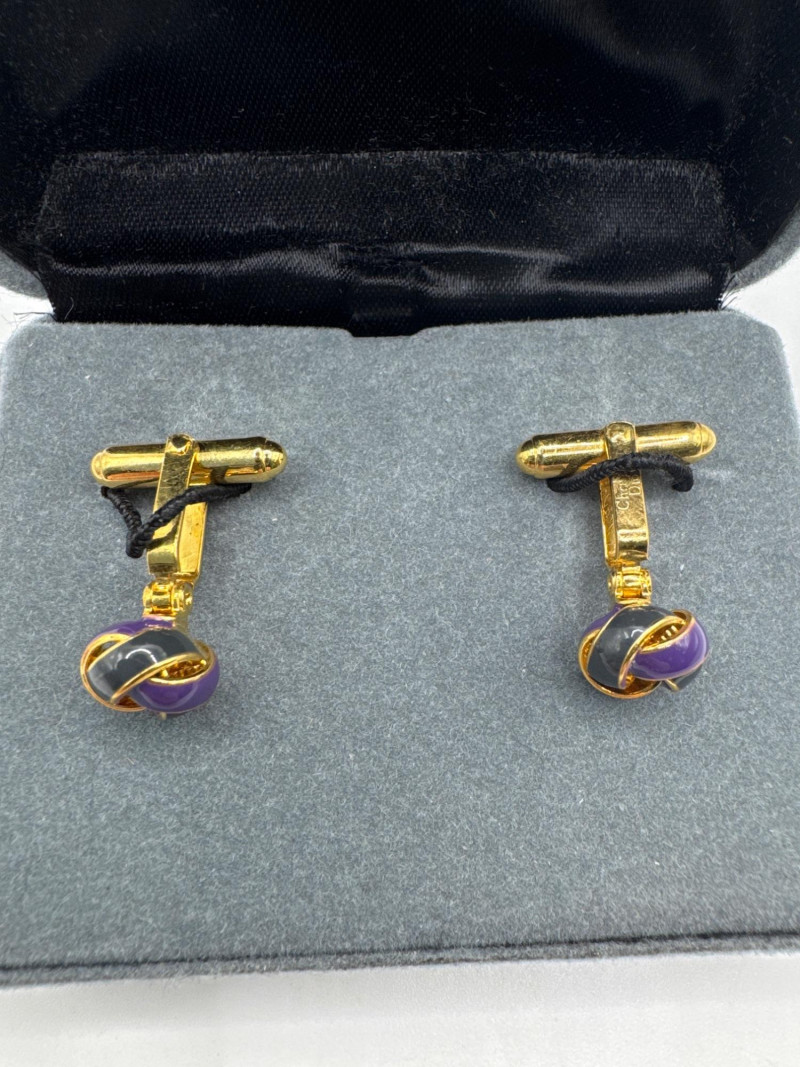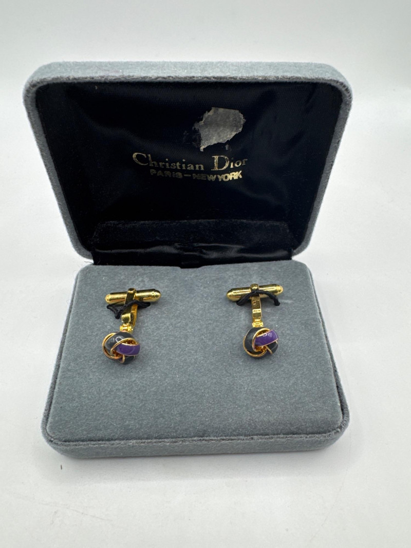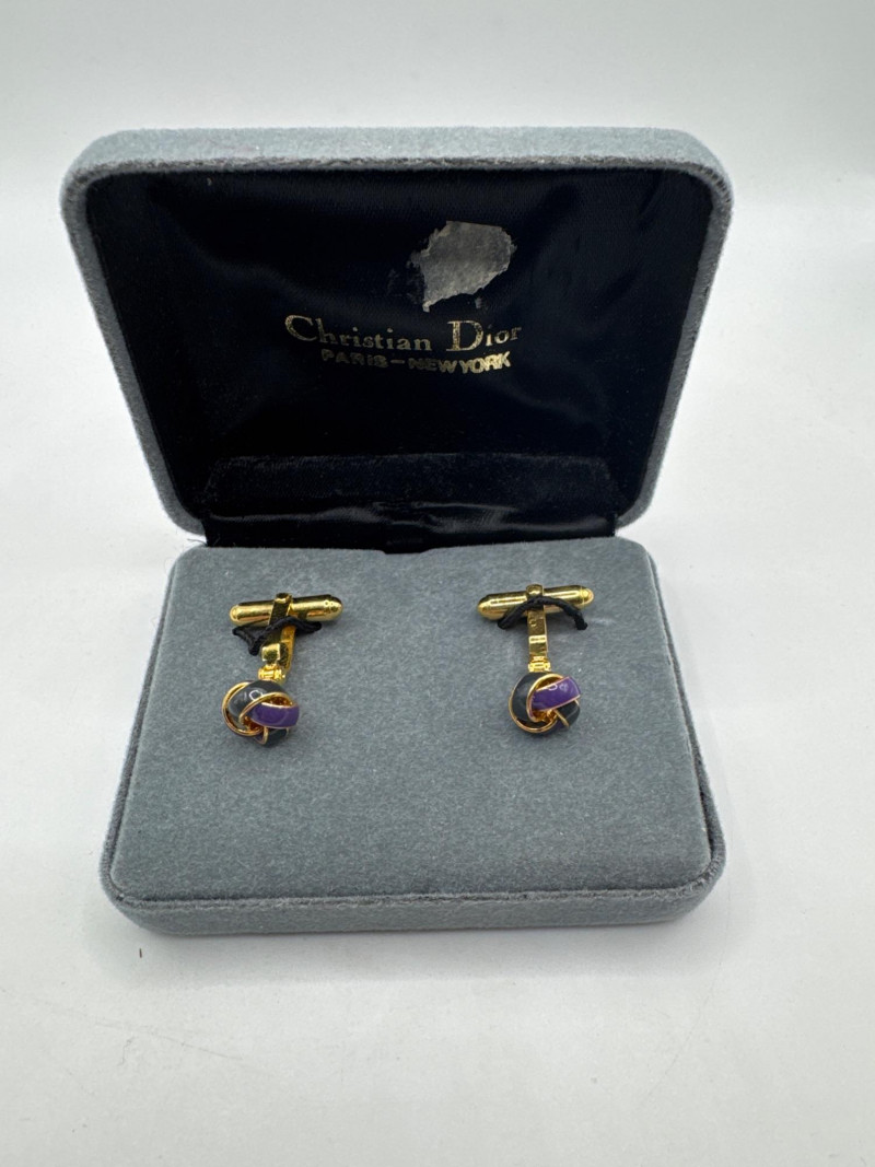These are vintage Christian Dior love knot cufflinks, typically dating from the 1970s to 1980s. This specific pair features a gold-tone base with a unique purple and black enamel swirl design.