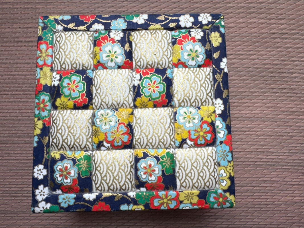 2 nicely decorative jewelry boxes. Made of cardboard but the tops are thin "quilted" silk material. Lg 5x5 sm 3.5x3.5
