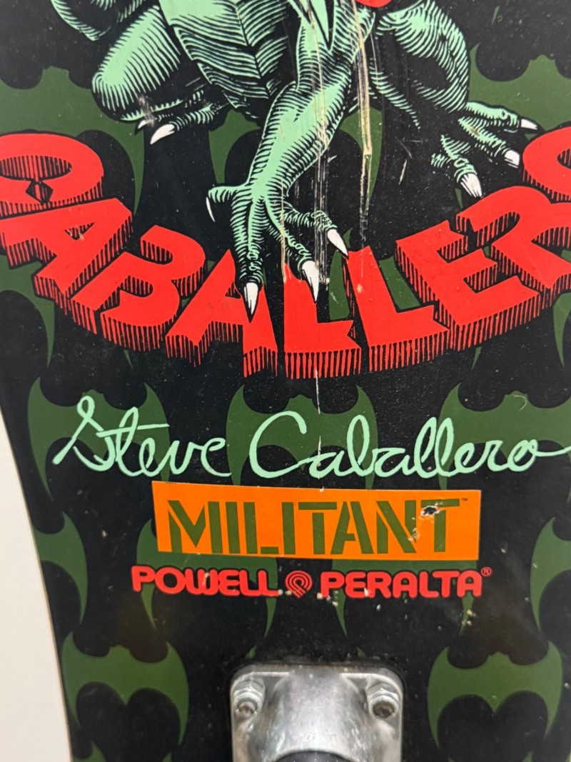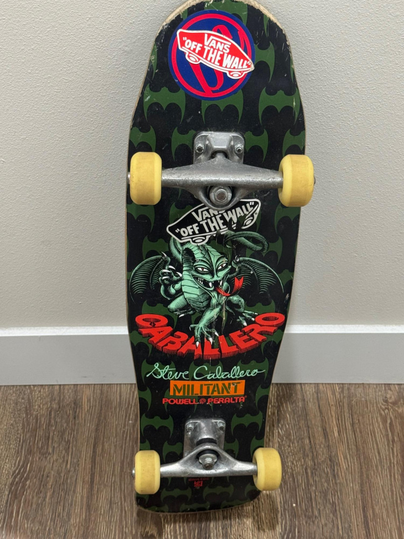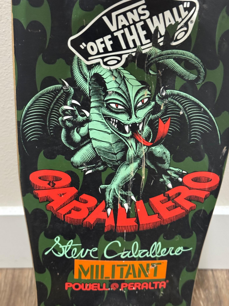 Powell Peralta Steve Caballero “Dragon Bats” deck with original graphic art. A true piece of skate history, this board features the iconic dragon artwork that made Caballero’s pro models legendary among collectors and skaters alike