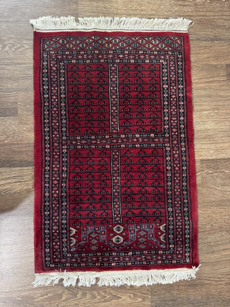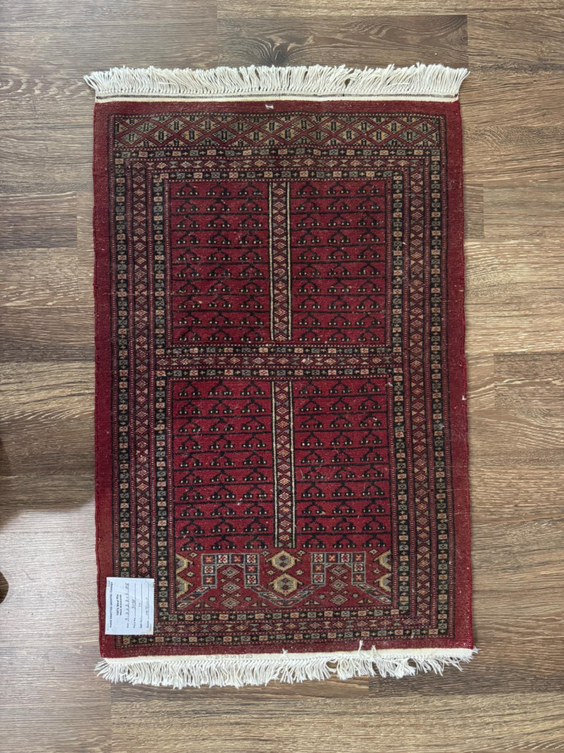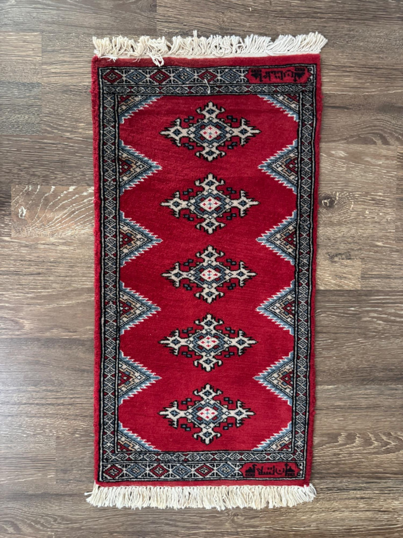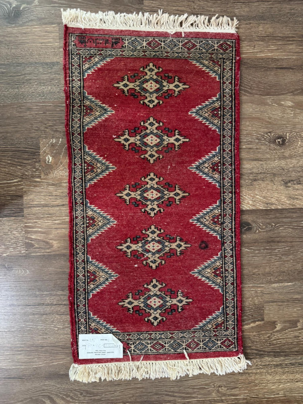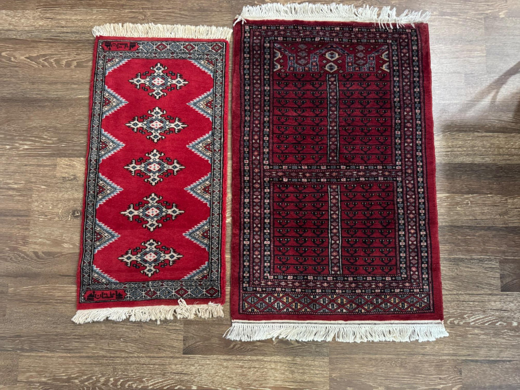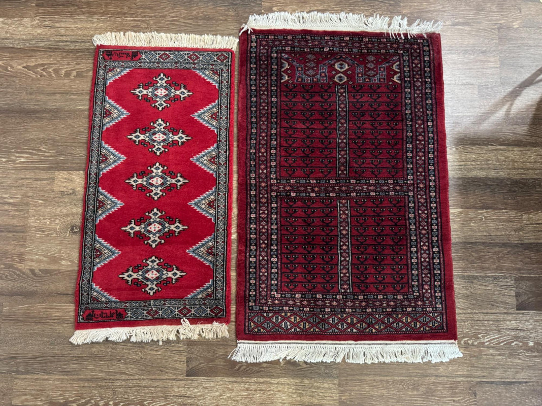 Beautiful hand-knotted Pakistani rugs, crafted with 100% wool and showcasing intricate detail and traditional design. Known for their durability and artistry, Pakistani rugs are highly regarded among collectors and home decorators alike. Both around 3'x2' with one a little bigger.