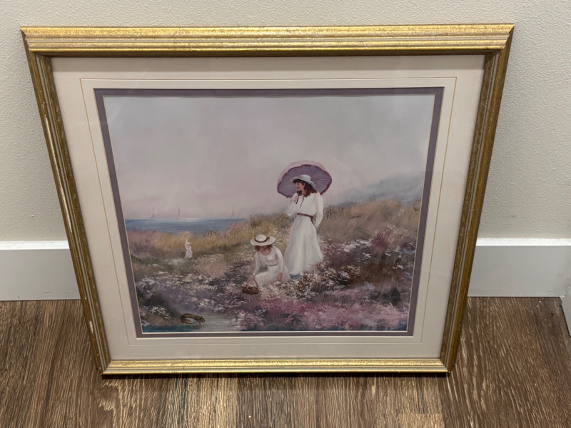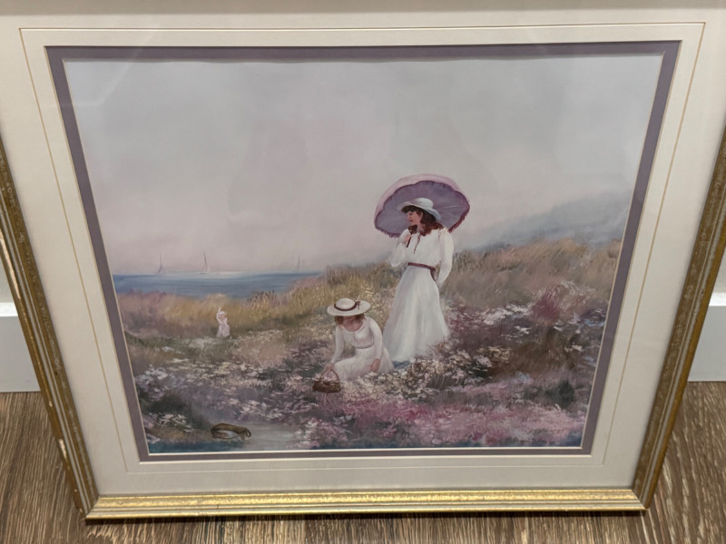 A romantic impressionist print by artist Gail Ann, depicting two women in white dresses in a flowered meadow by the sea. One holds a lavender parasol while the other gathers blooms into a basket. Sailboats drift in the soft pastel background, giving the piece a calm, timeless quality.