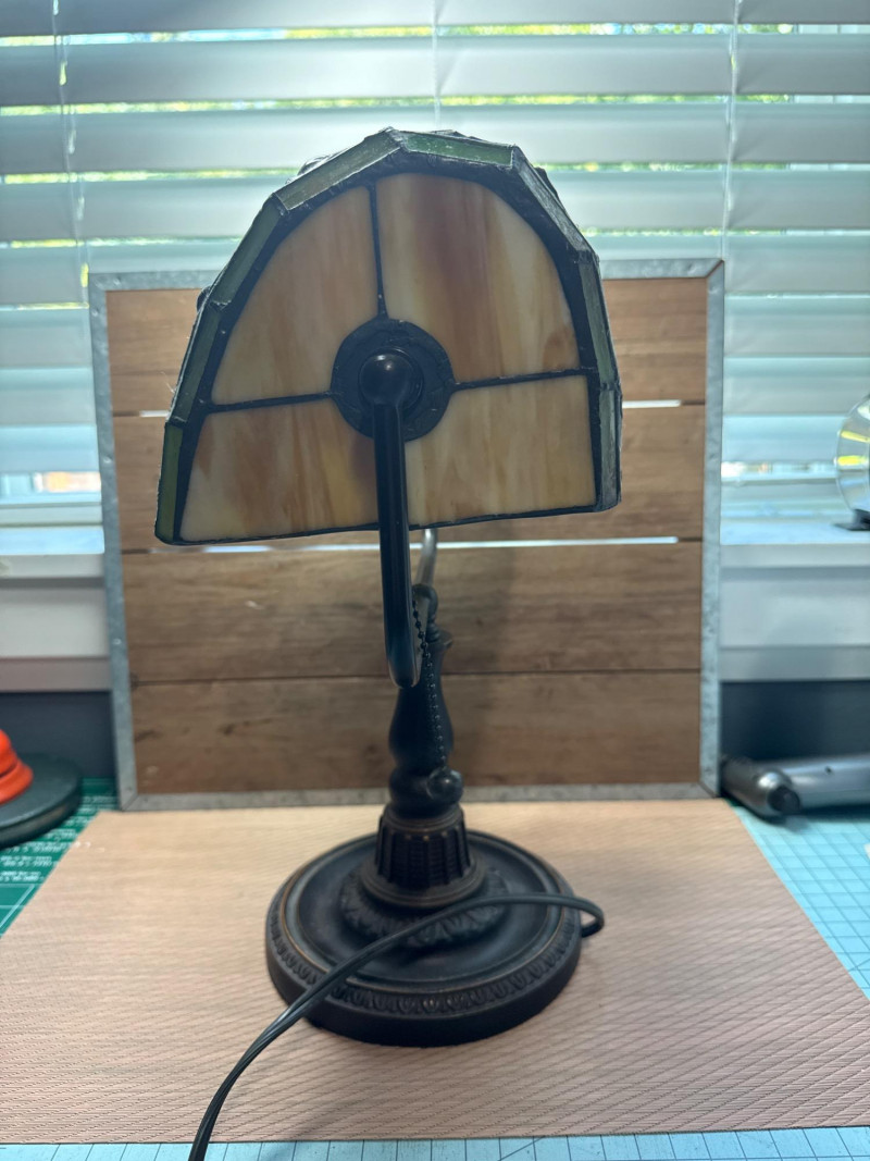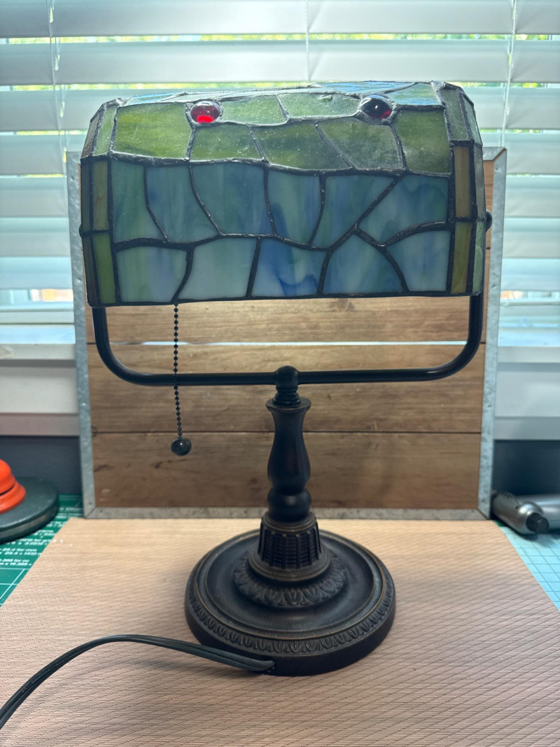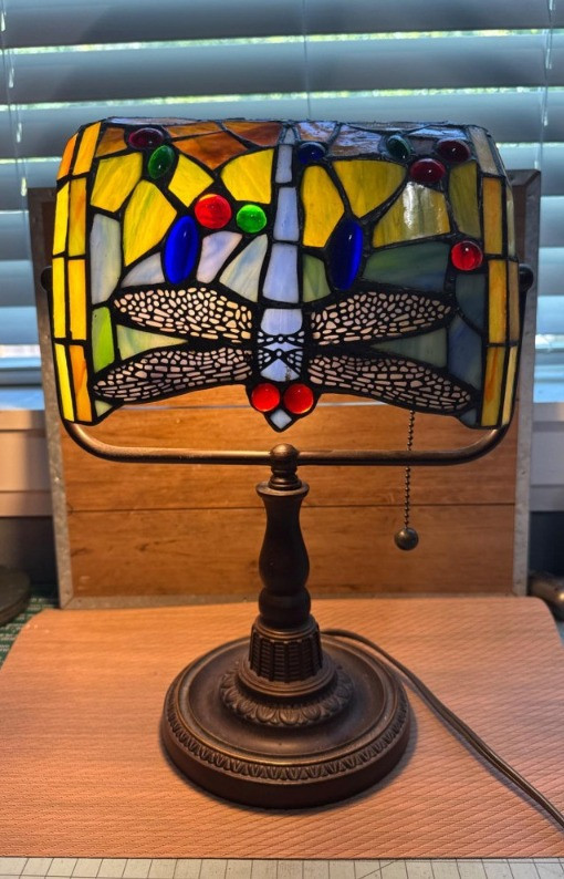 Tiffany-style Dragonfly desk lamp, featuring vibrant stained glass and classic Art Nouveau design. This lamp adds a touch of elegance and color to any room, perfect for collectors of decorative lighting or lovers of vintage-inspired home décor.