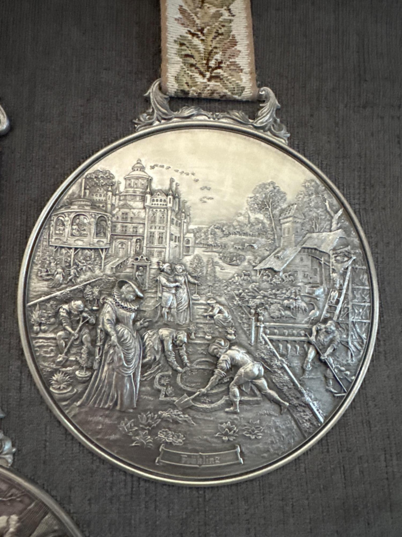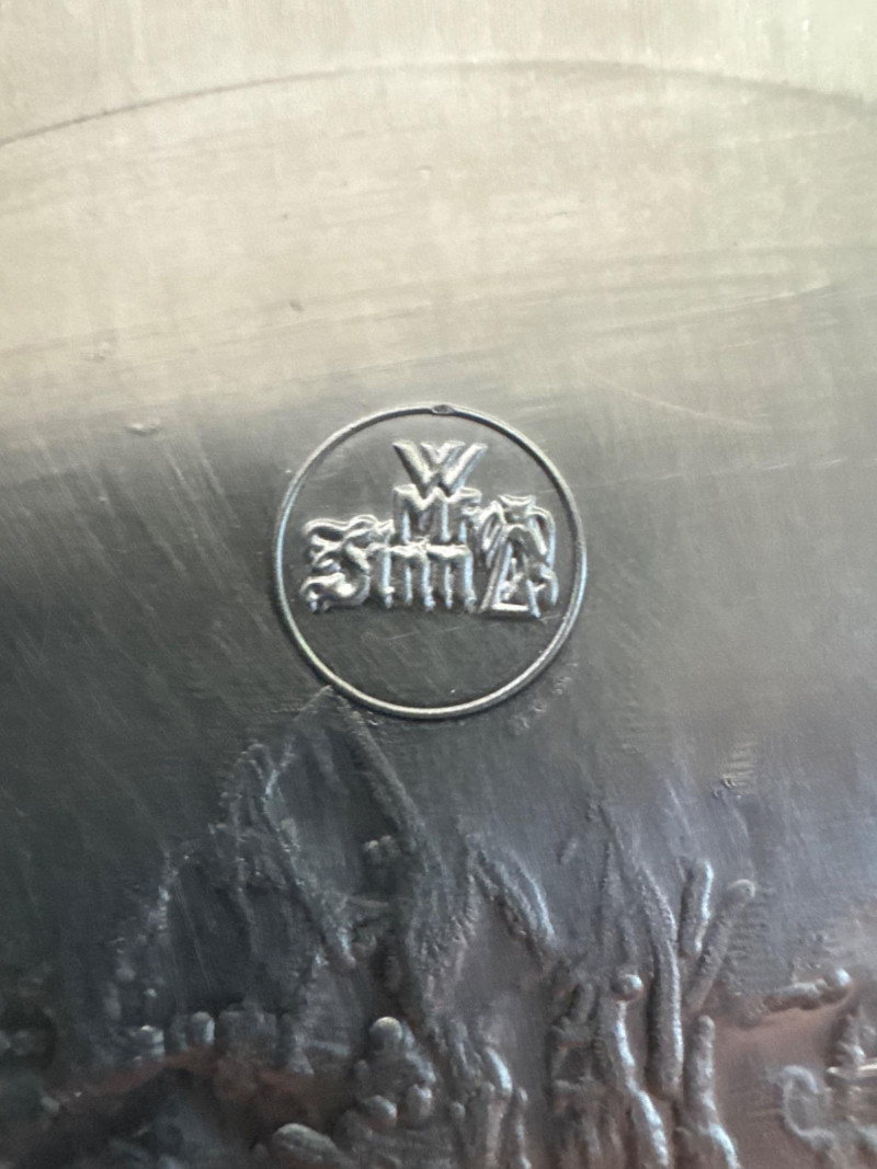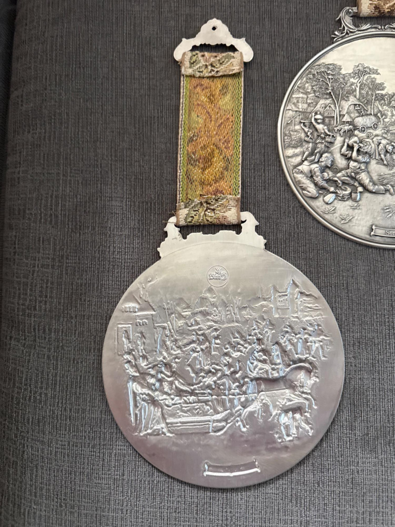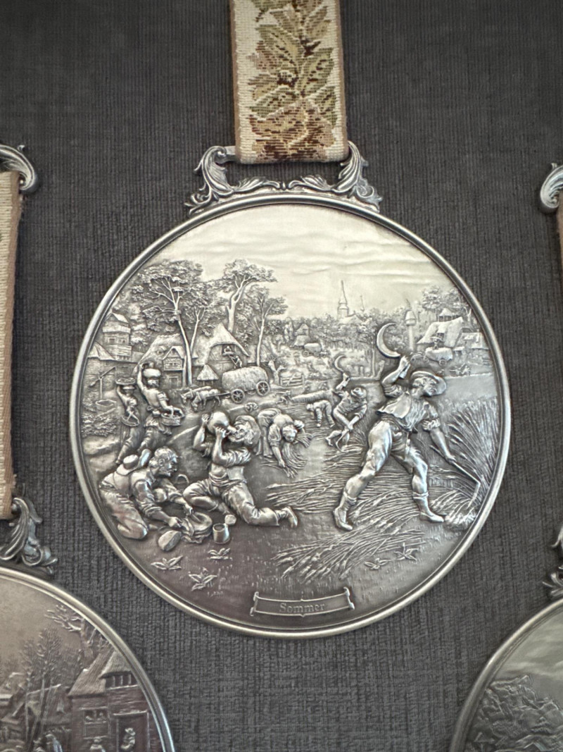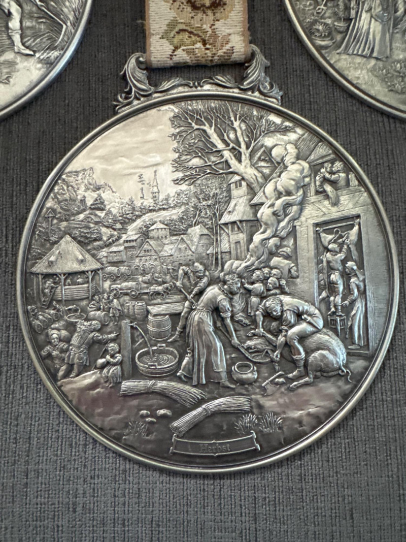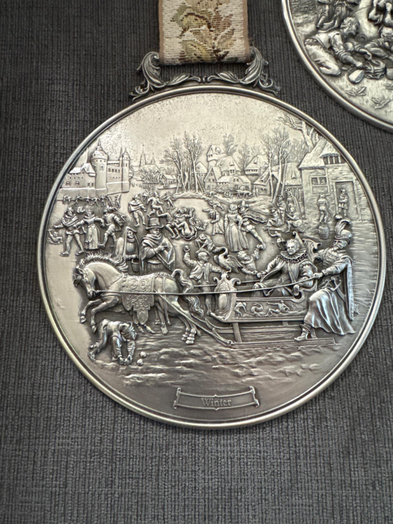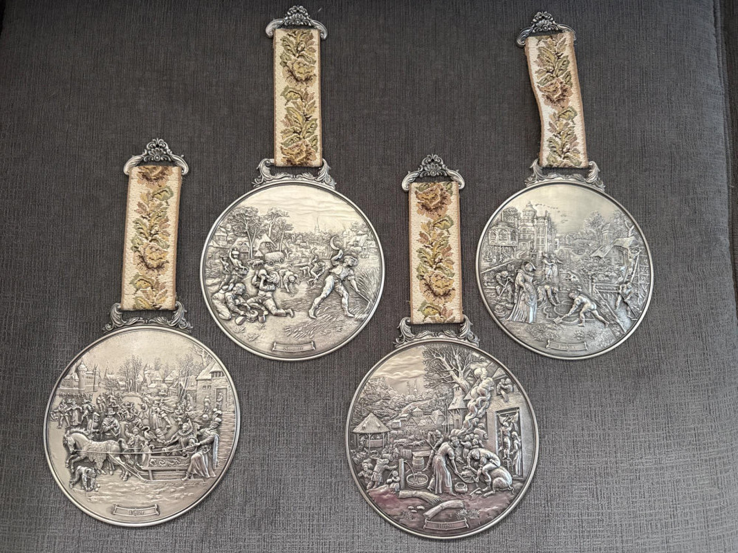 Vintage WMF (Württembergische Metallwarenfabrik) Zinn pewter wall medallions, a classic piece of German decorative art. Known for their craftsmanship, WMF pewter pieces are highly collectible and showcase intricate detail and timeless design. A medallion for each season.