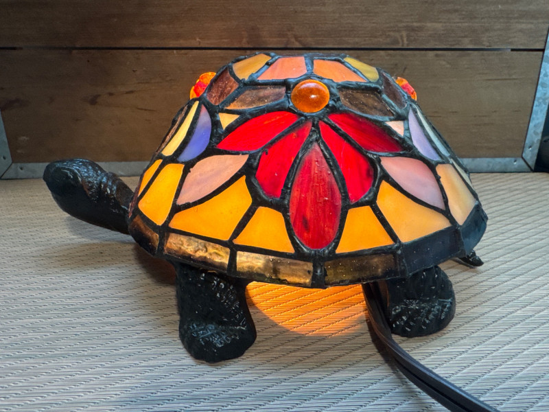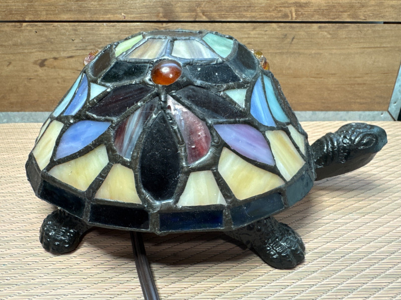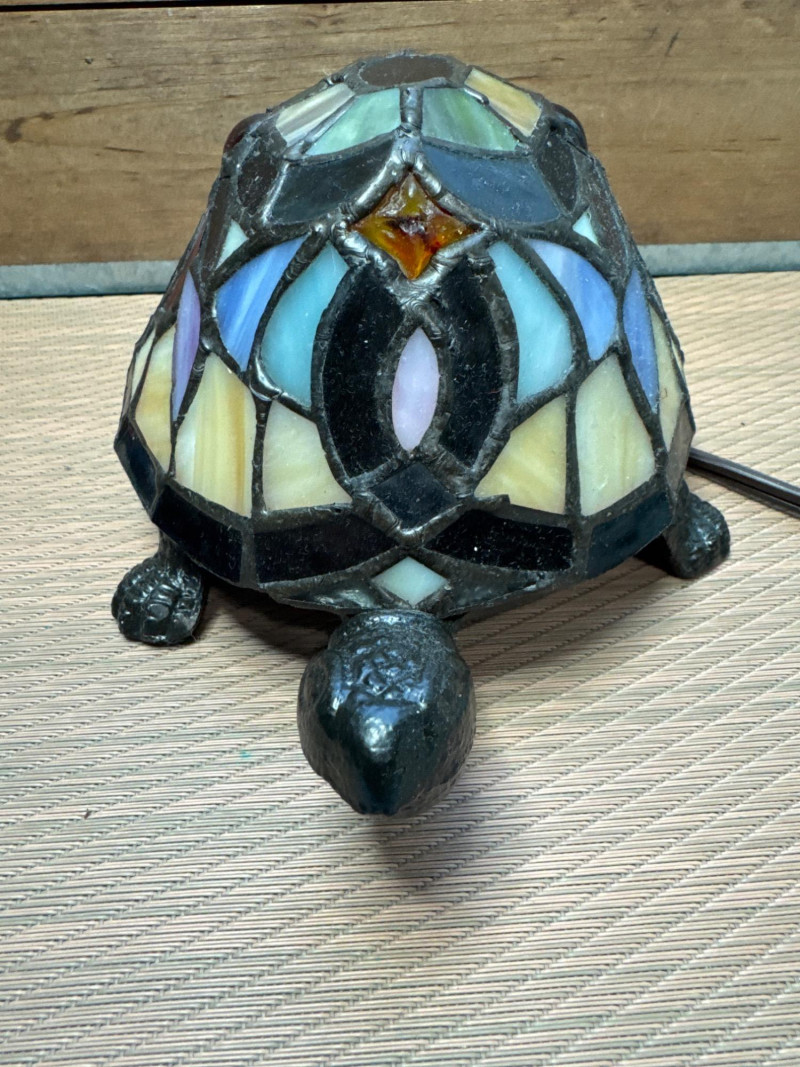 Tiffany-style stained glass turtle, handcrafted with vibrant glass pieces and a metal frame. Perfect for collectors of decorative glass, animal figurines, or Tiffany-inspired home décor, this piece adds color and character to any display.