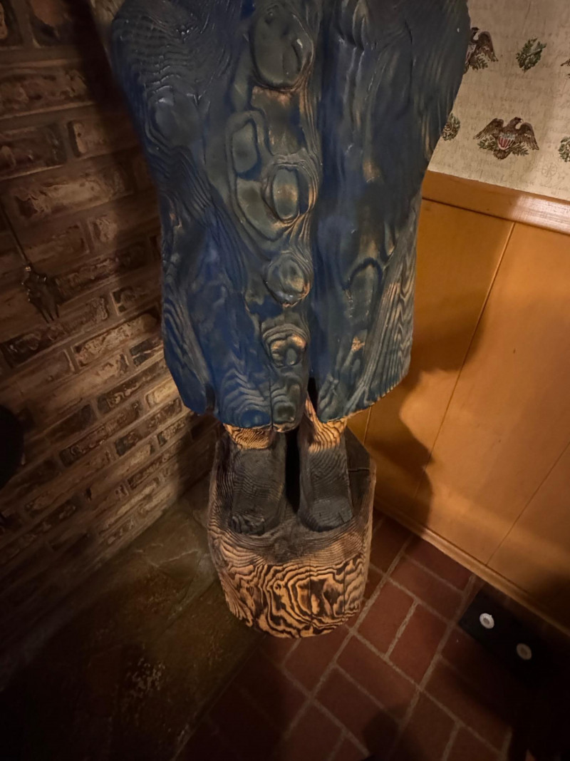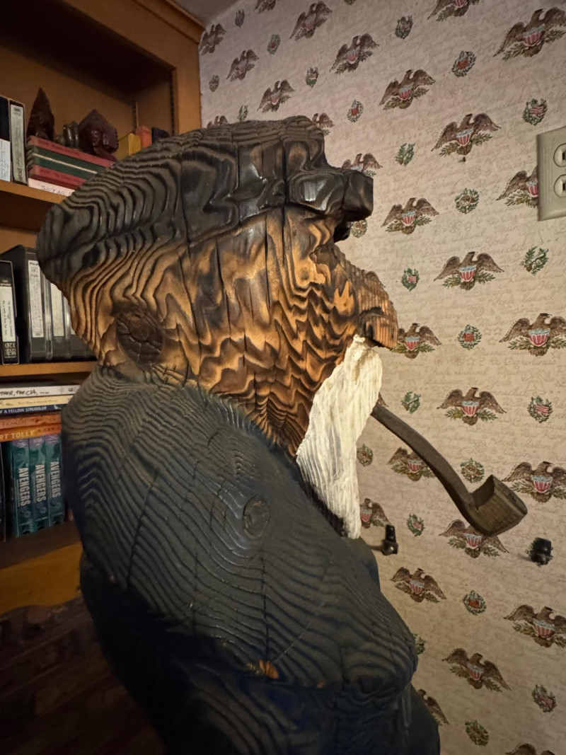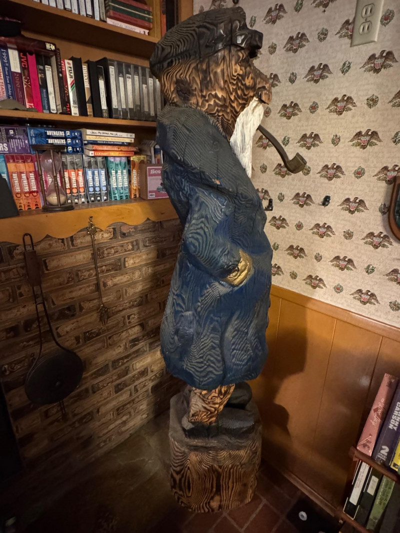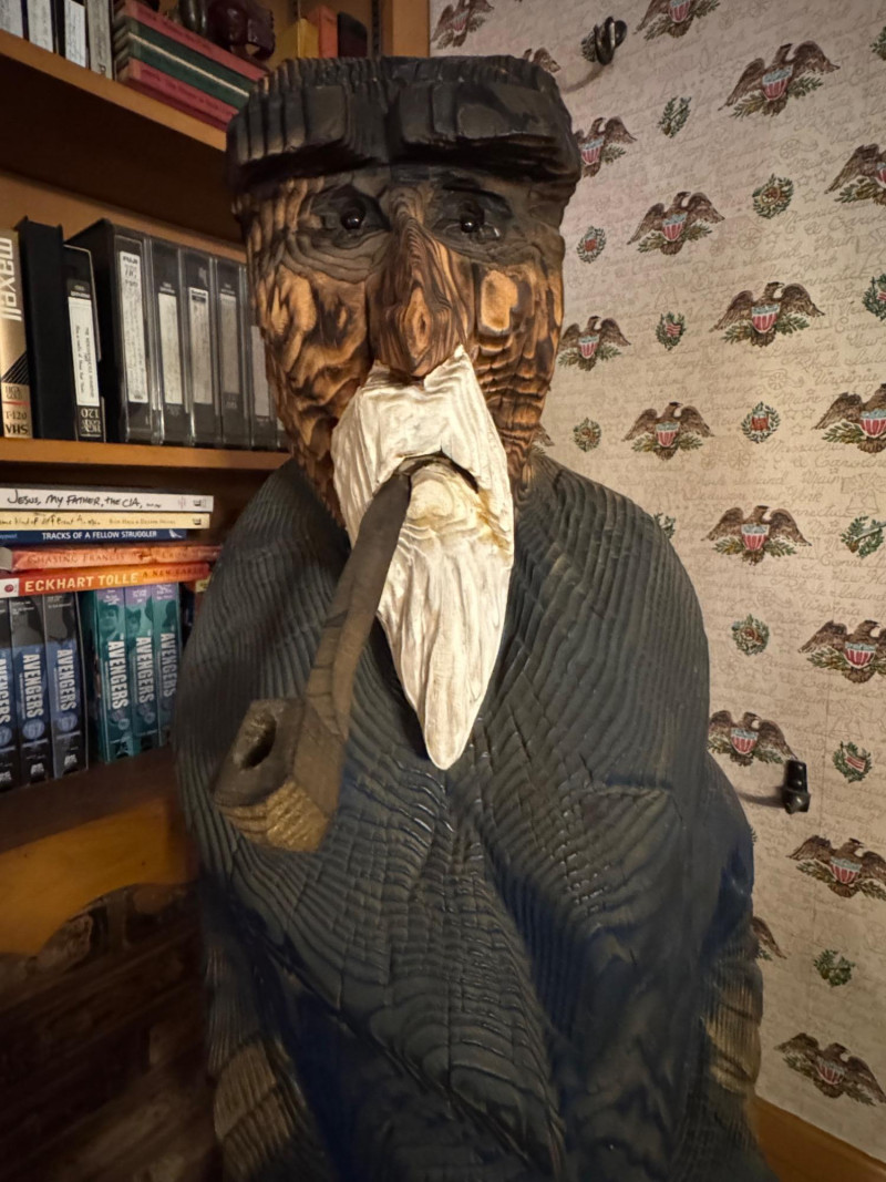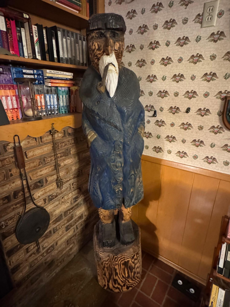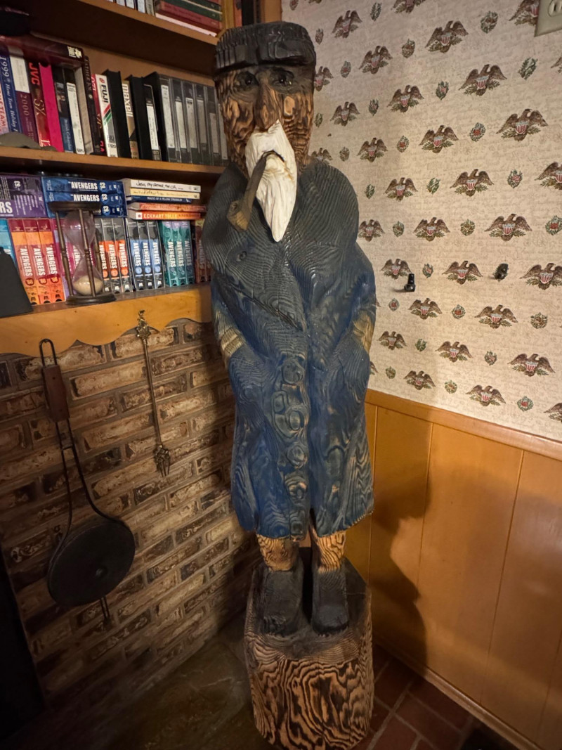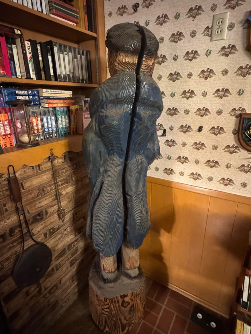 An impressive life-sized carving of a rugged sea captain, standing six feet tall and crafted entirely from solid wood. The figure is depicted in traditional fisherman’s attire, with detailed facial features, textured beard, and nautical clothing that highlight the artisan’s craftsmanship. Richly carved with natural wood tones and patina, this statue makes a bold decorative statement. Perfect as a coastal or nautical display piece, it brings character and maritime charm to any space—whether showcased in a home, lodge, seafood restaurant, or marina. Approximately 6' in height.