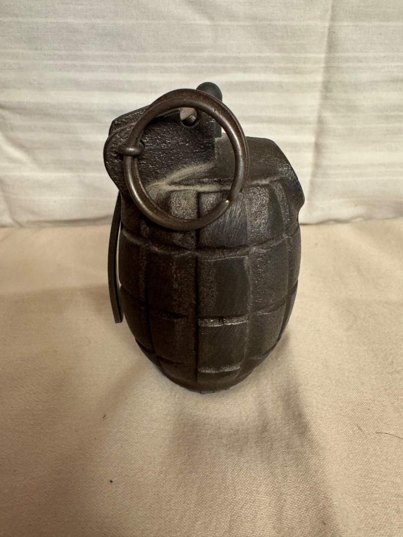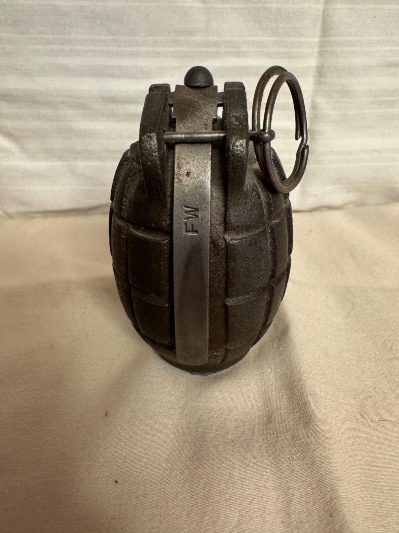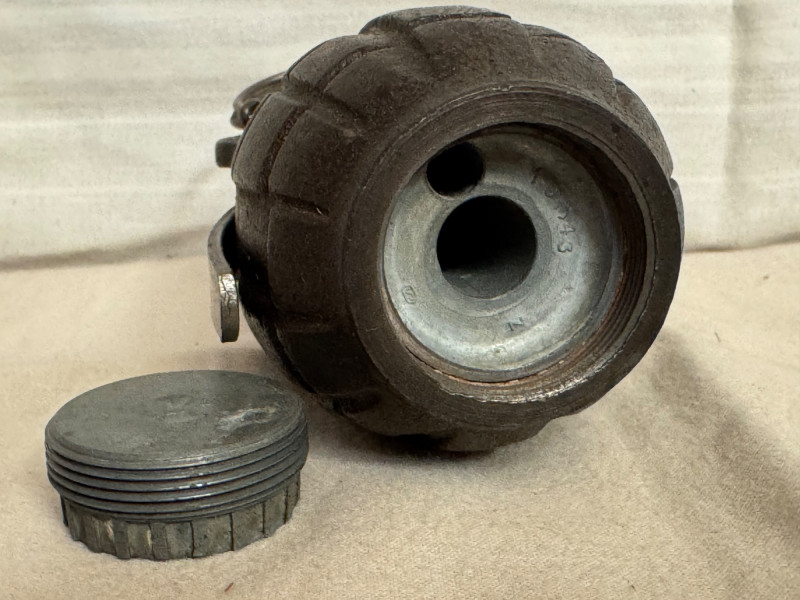 Mk I → First mark (model) of this particular grenade pattern. The grenade body is empty (there’s a large central threaded hole where the fuze assembly would normally be inserted).