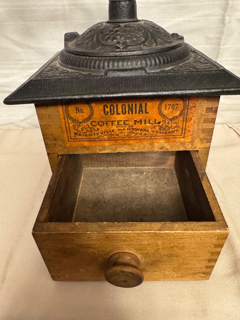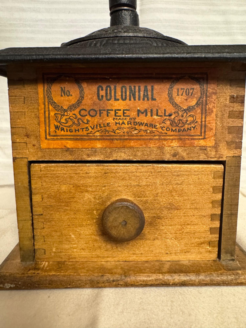 The Colonial Coffee Mill No. 1707 is a vintage hand-crank coffee grinder produced by the Wrightsville Hardware Company, likely in the 1960s.