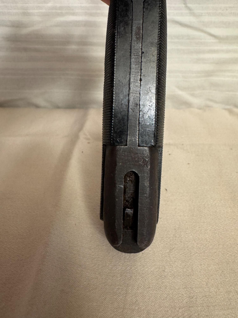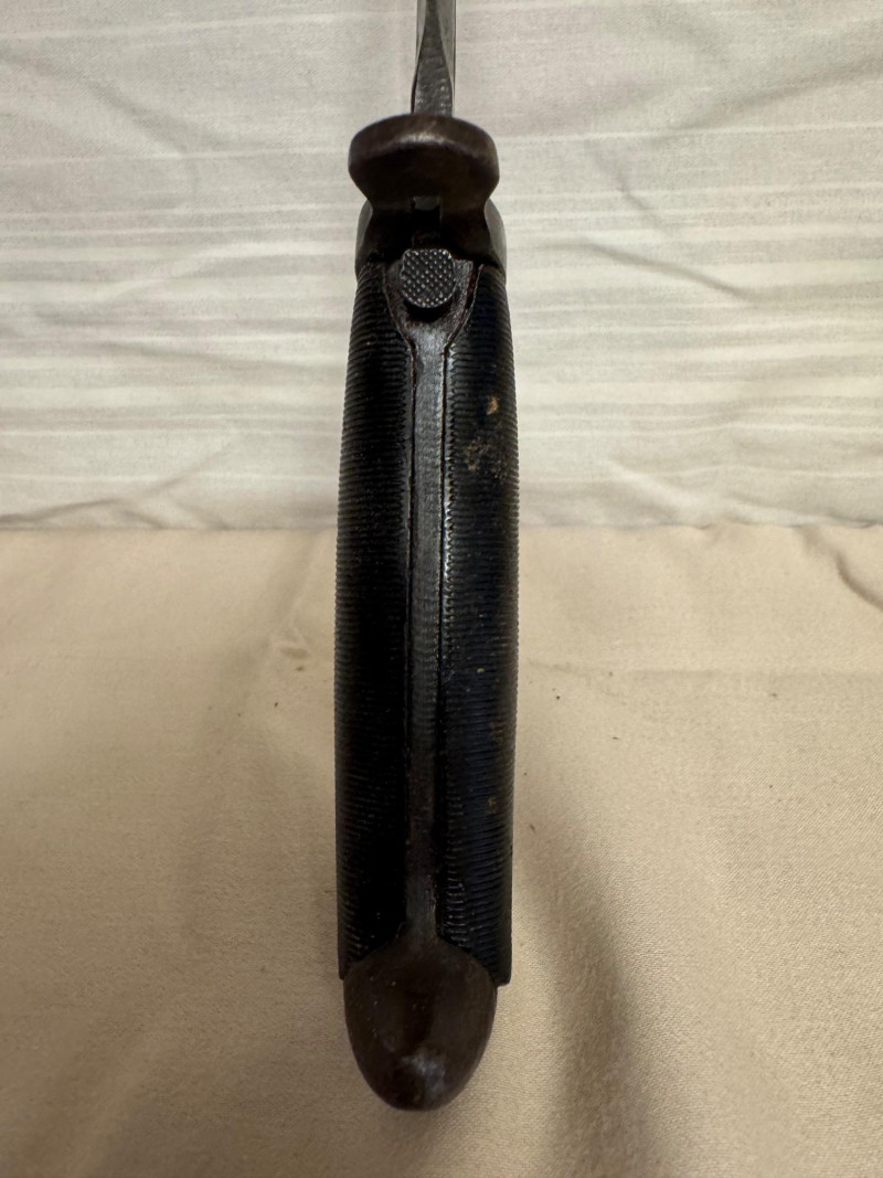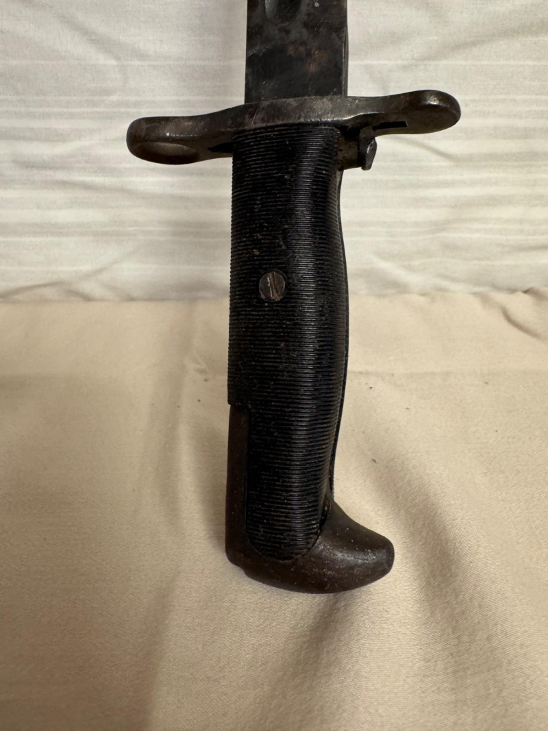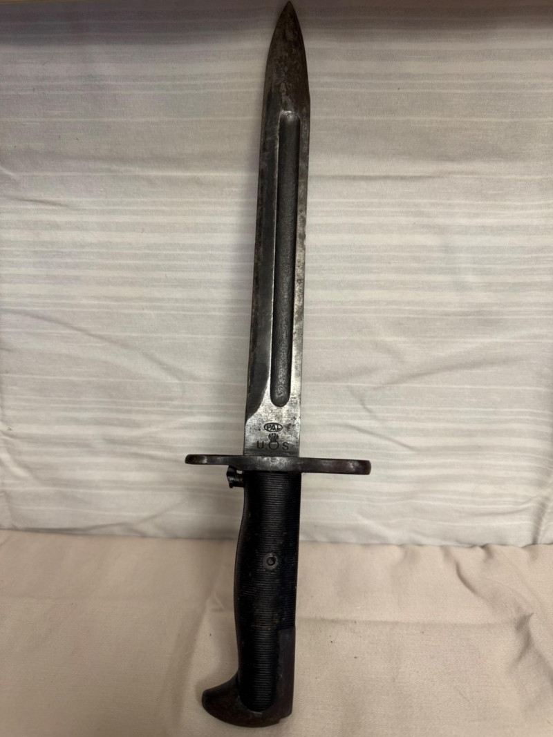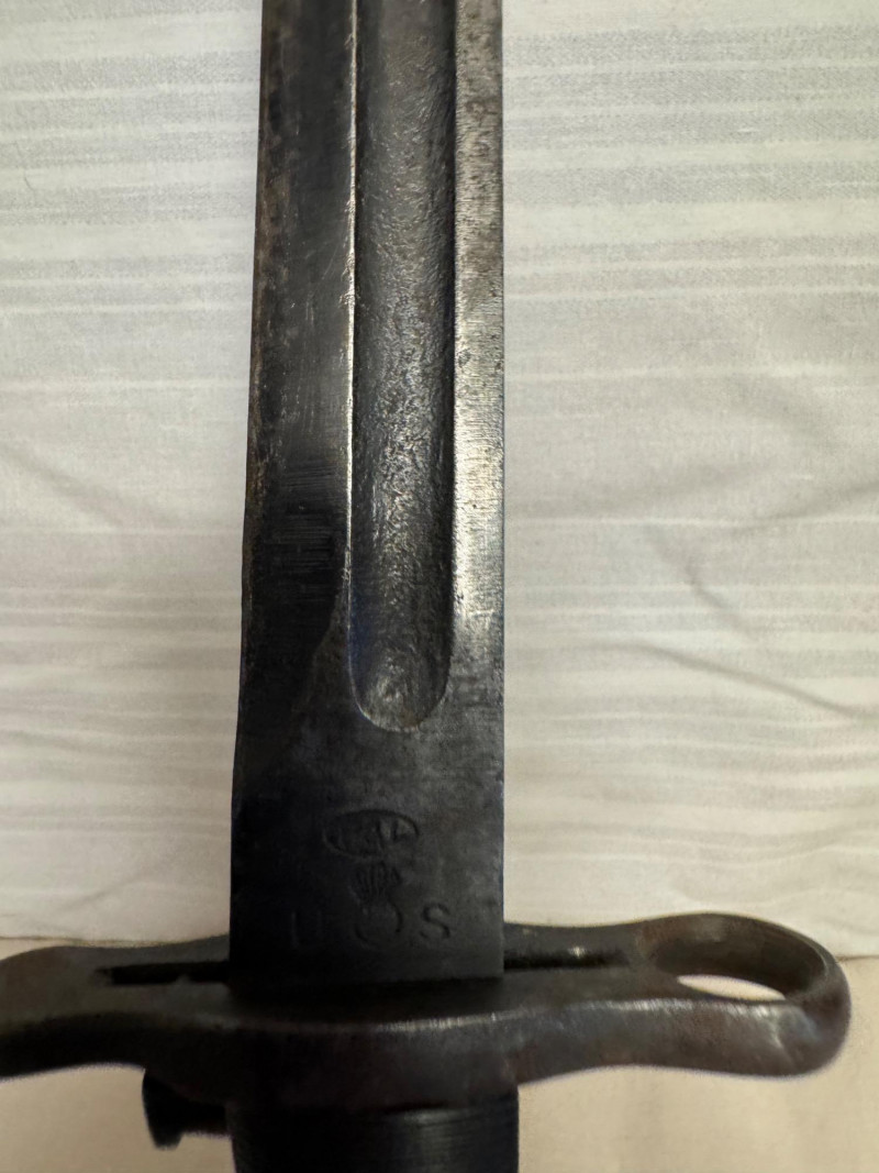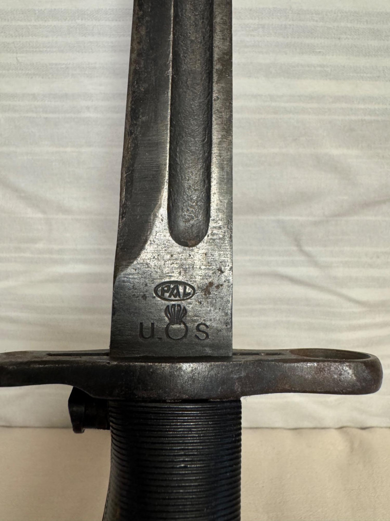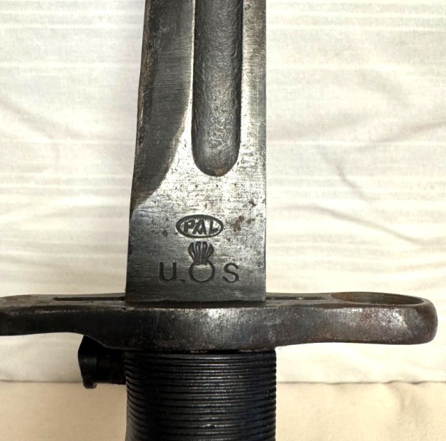 U.S. M1905/M1942 bayonet for the M1 Garand rifle, manufactured by PAL (Pal Blade & Tool Company, Holyoke, Massachusetts). Here’s a breakdown of the markings and features: "PAL" in the oval → Manufacturer’s stamp. PAL produced about 1 million bayonets during WWII, making them one of the major contractors. Flaming bomb ordnance mark → U.S. military inspection and acceptance stamp. "U O S" → Stands for "United States Ordnance."