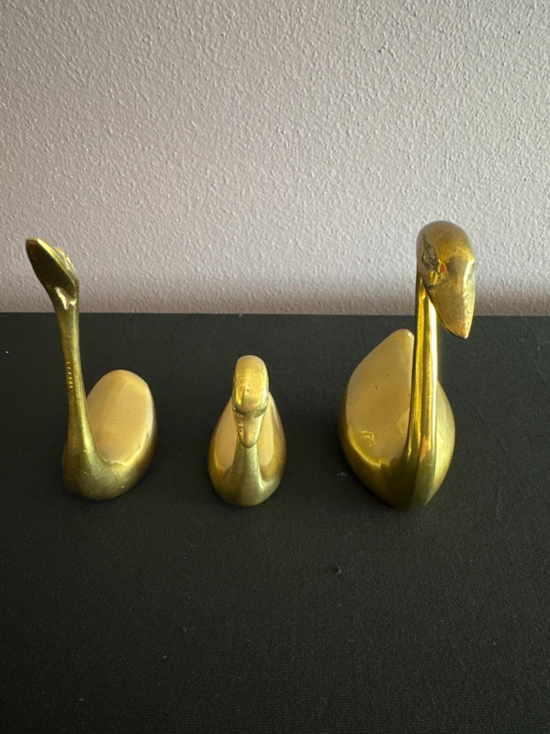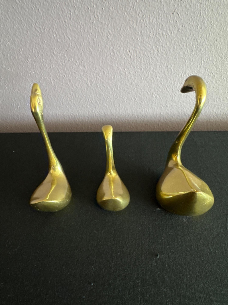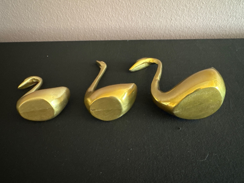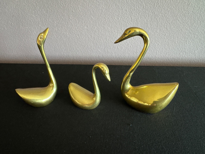 Set of 3 Vintage Brass Swans – Elegant trio of solid brass swans in graduated sizes. Largest 4"x4", Medium 4"x2", Smallest 2.5"x2.5"