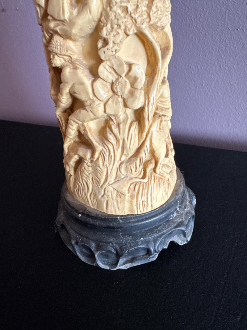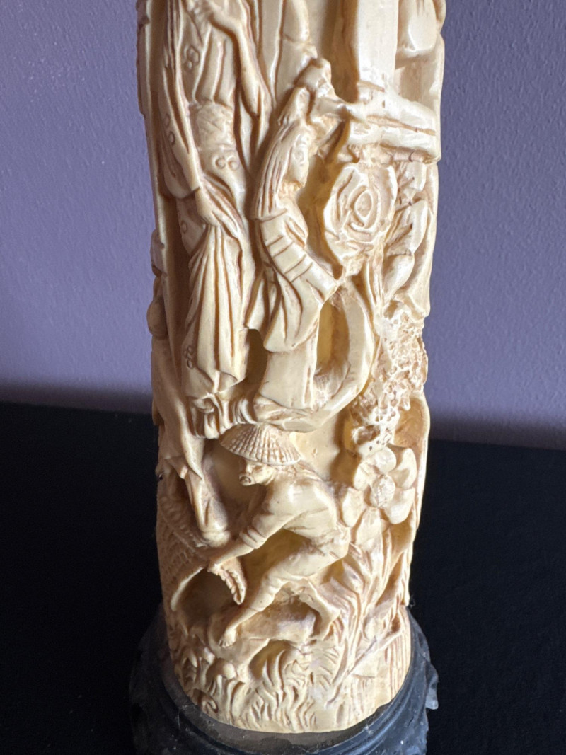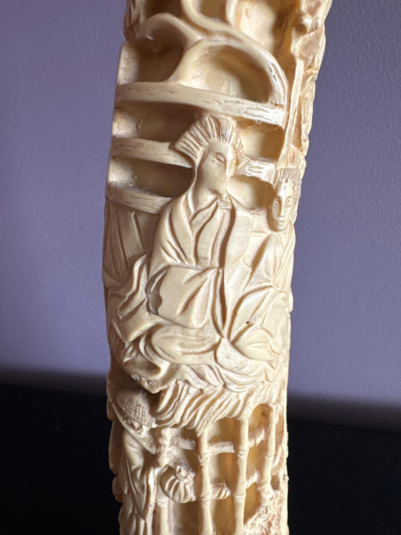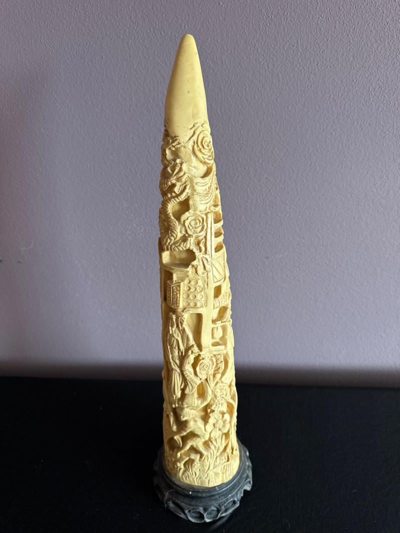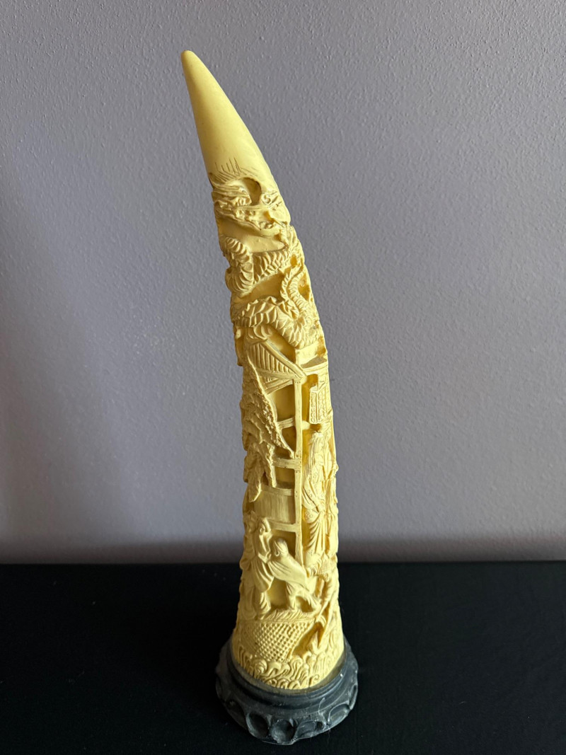 Lot # 8 - Carved Faux Ivory Resin Tusk – Asian Dragon & Pagoda Scene, 17" Tall