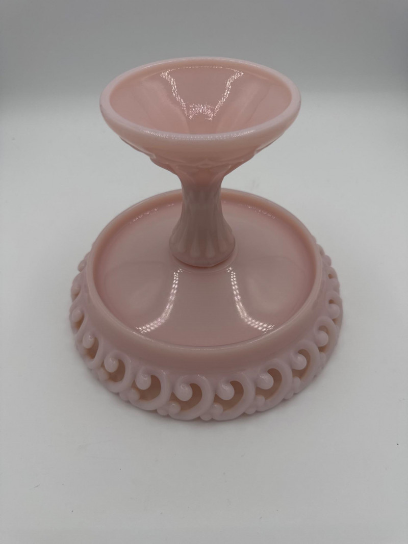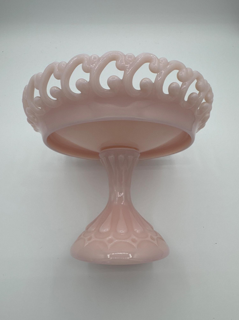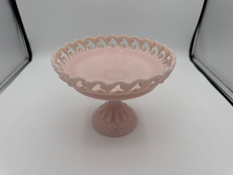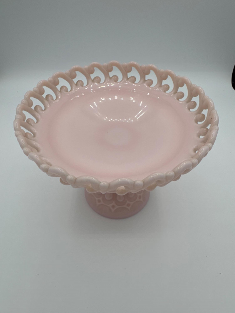 Elegant vintage pink milk glass compote featuring an ornate lace edge and decorative pedestal base. Perfect as a centerpiece, candy dish, or vanity display piece.