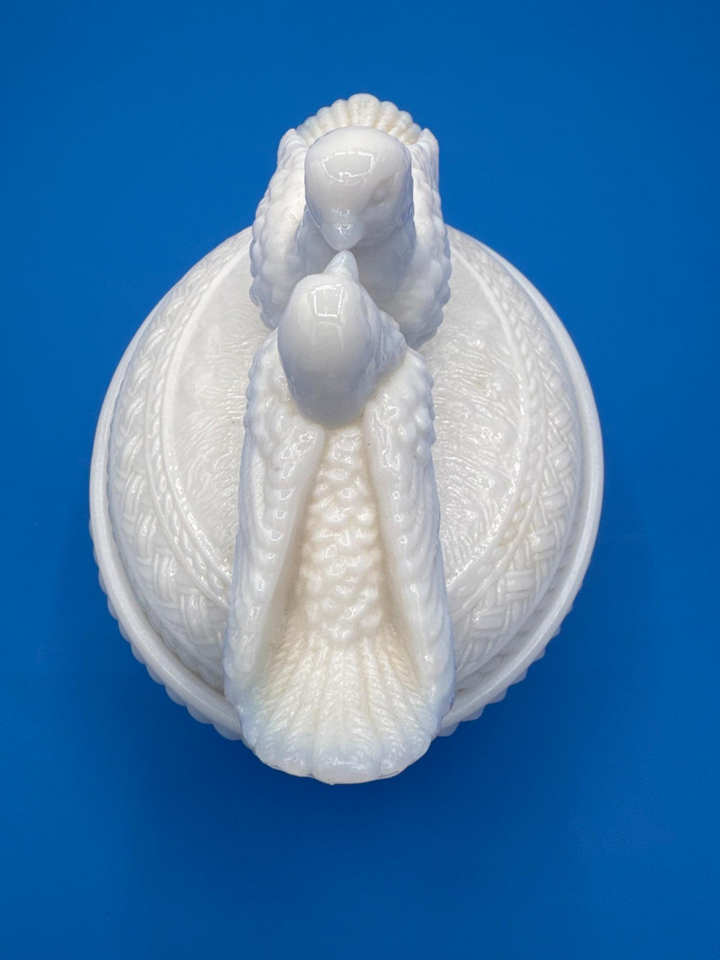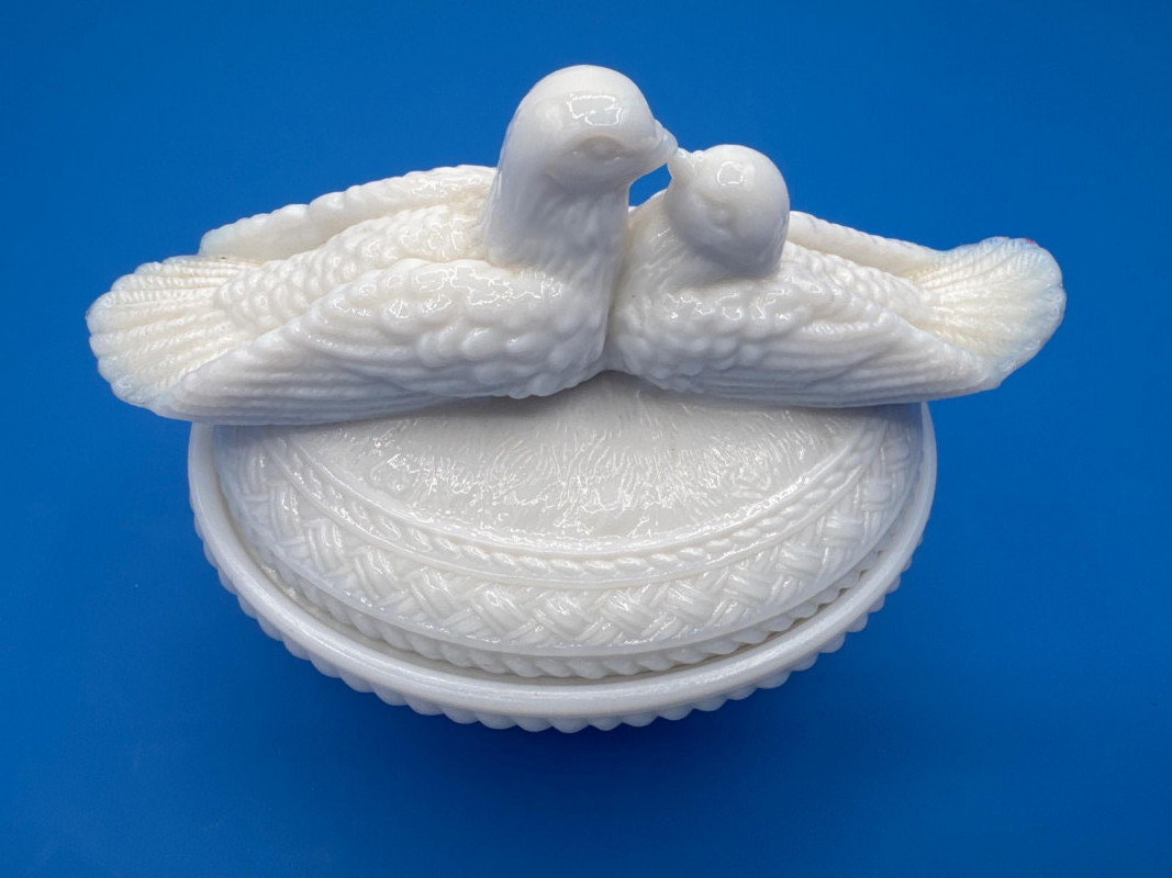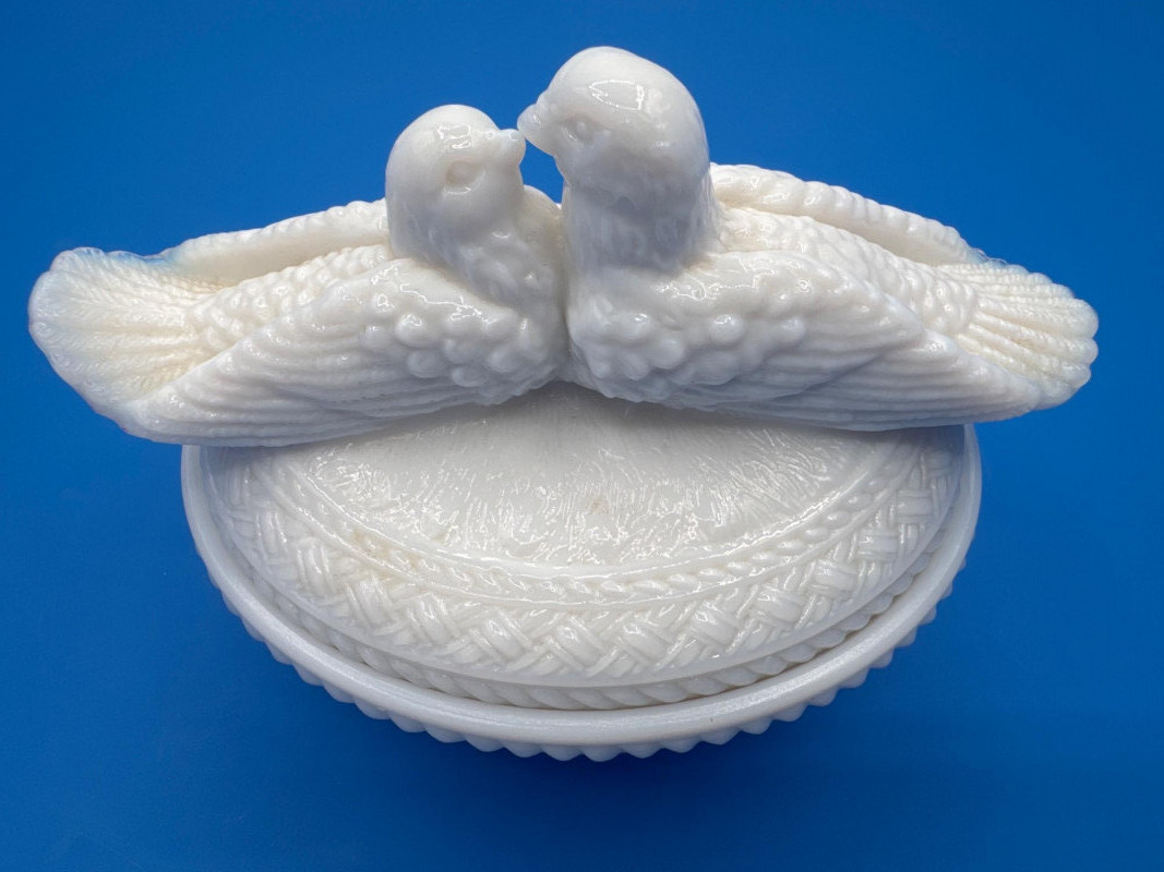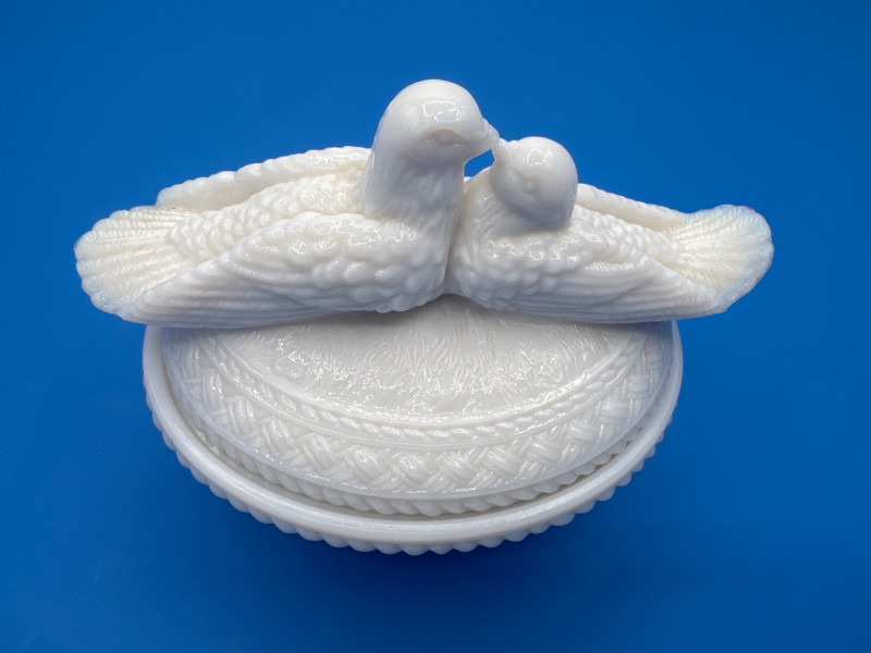 This style is typically described as “Kissing Doves on a Nest” or “Love Birds on a Nest” covered dish in milk glass made by Westmoreland.