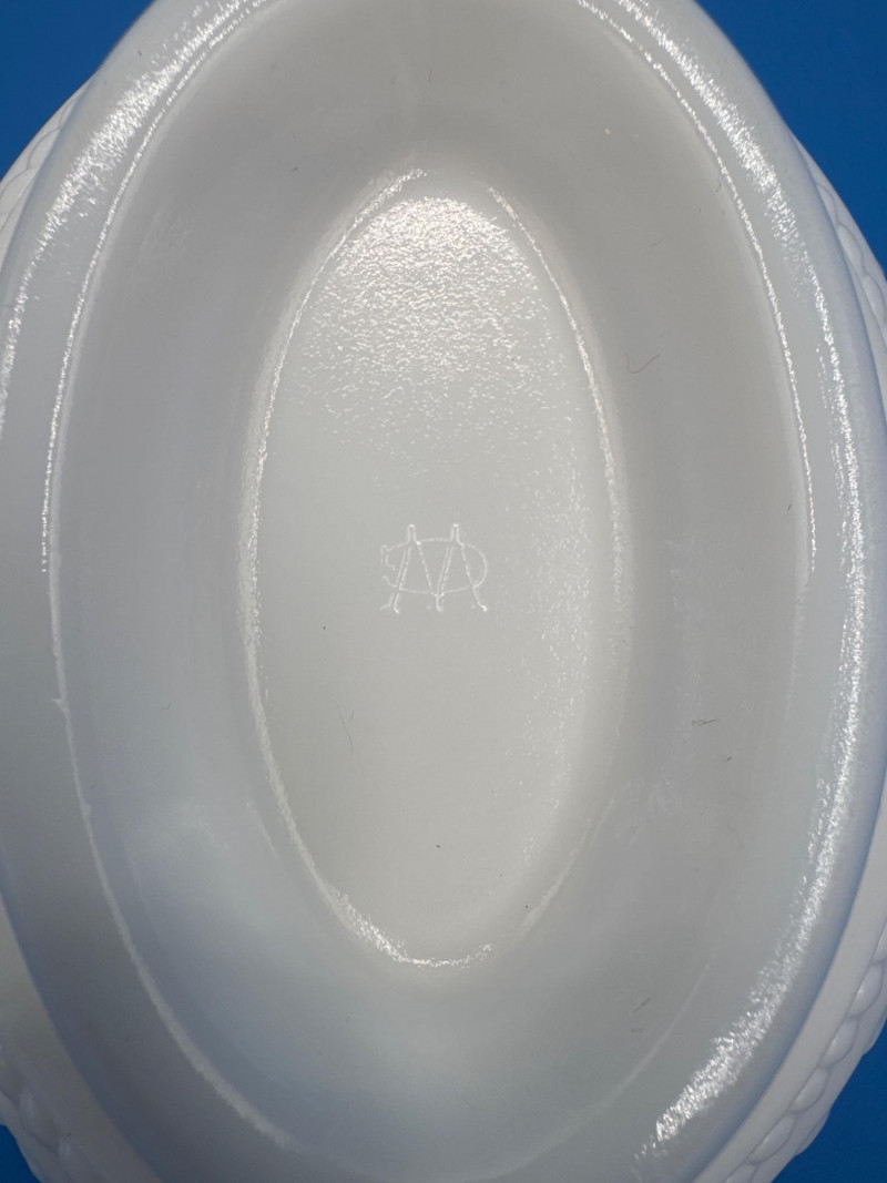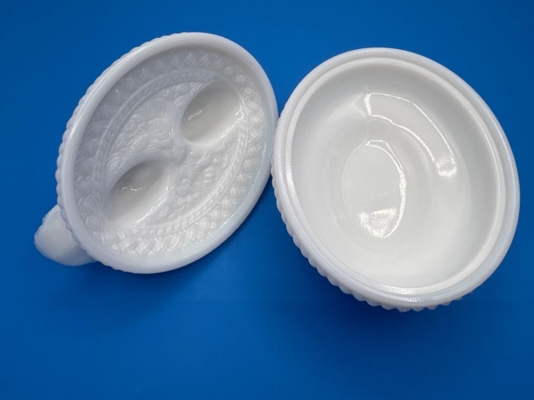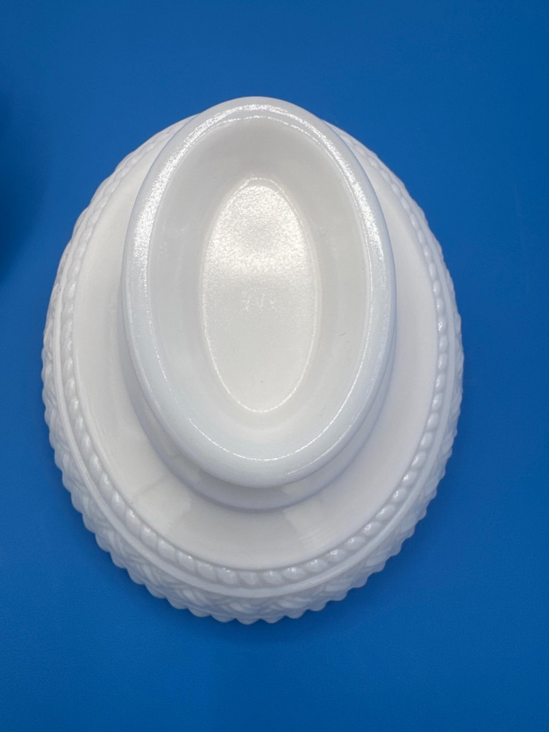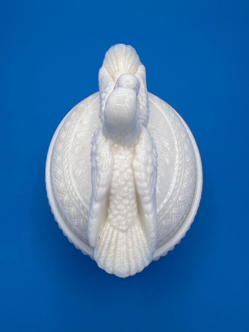 This style is typically described as “Kissing Doves on a Nest” or “Love Birds on a Nest” covered dish in milk glass made by Westmoreland.