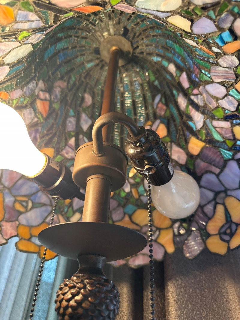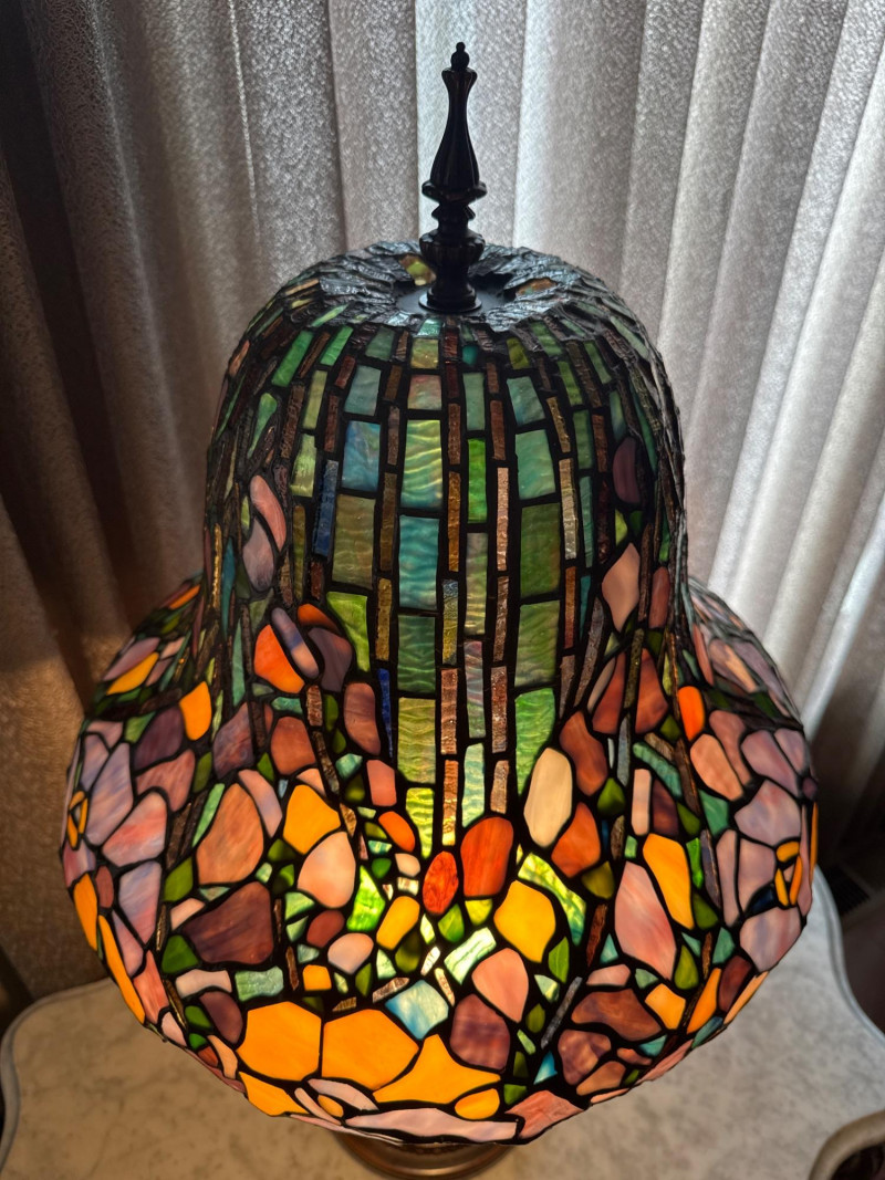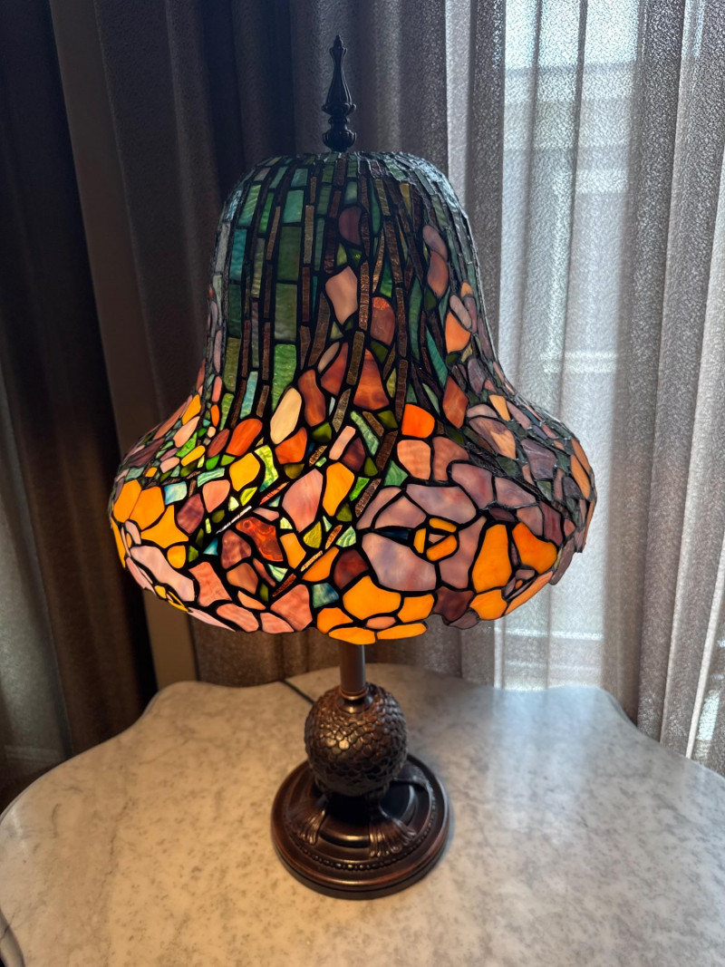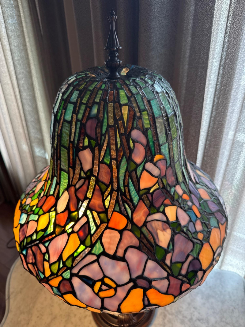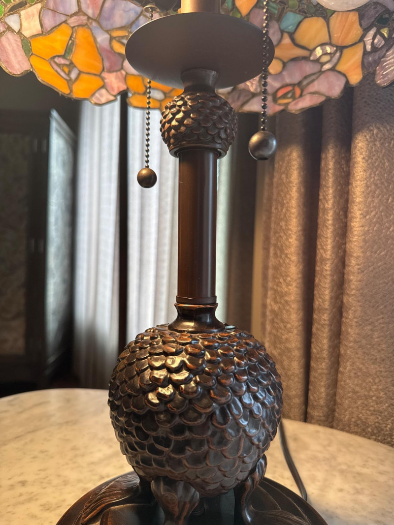 This is a stained glass Tiffany-style table lamp, featuring a floral and leaf motif in warm tones of amber, pink, green, and violet, with a bronze-toned metal base.