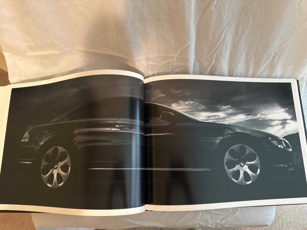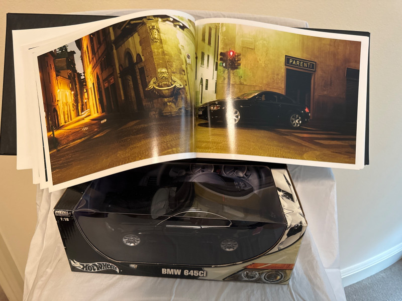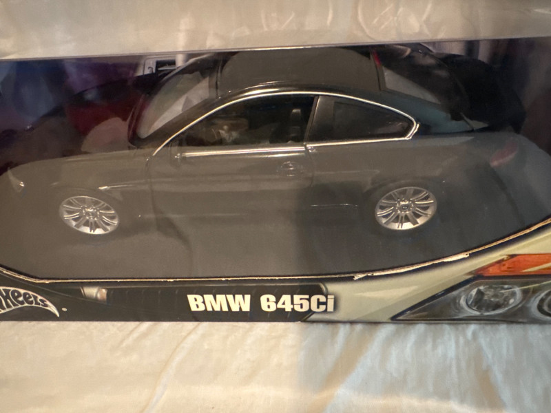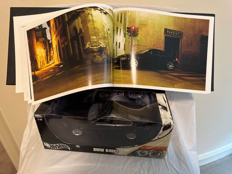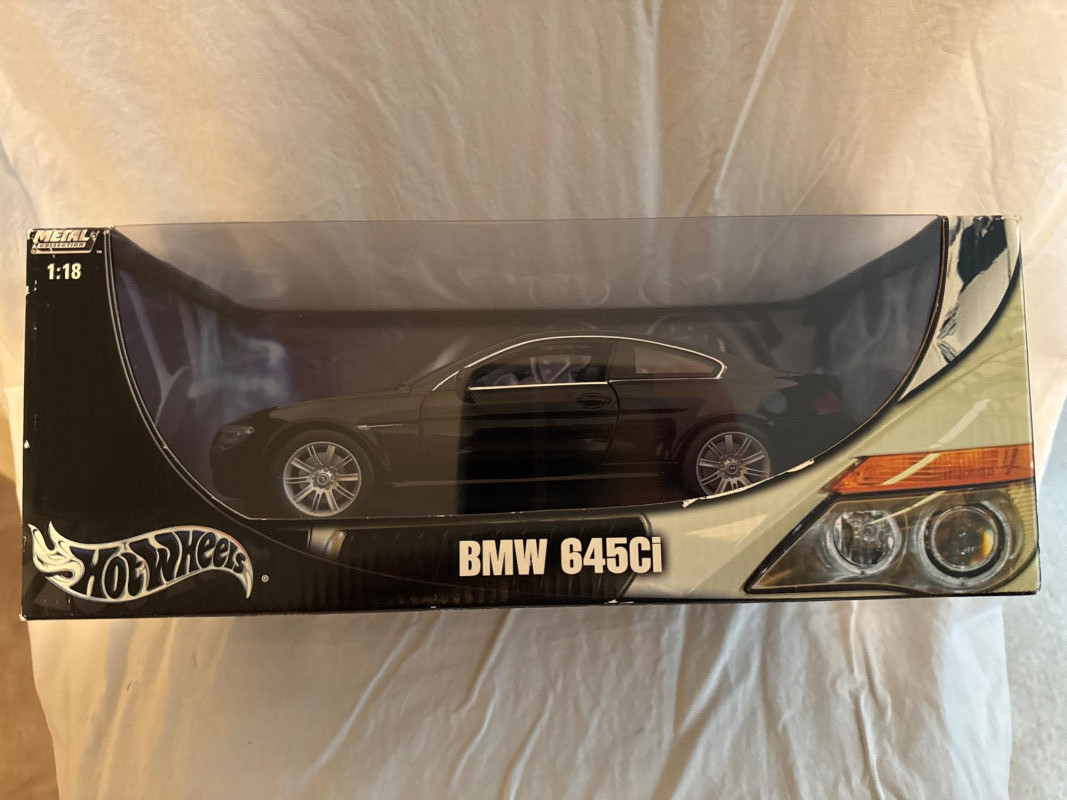 HOT WHEELS 1:18 BMW 645 CI 2003 BLACK DieCast MATTEL with a BMW 6-Series book.