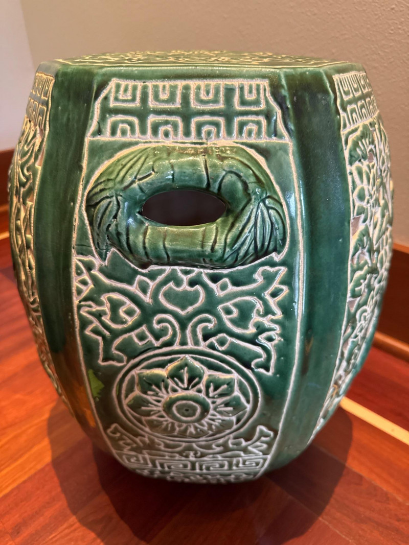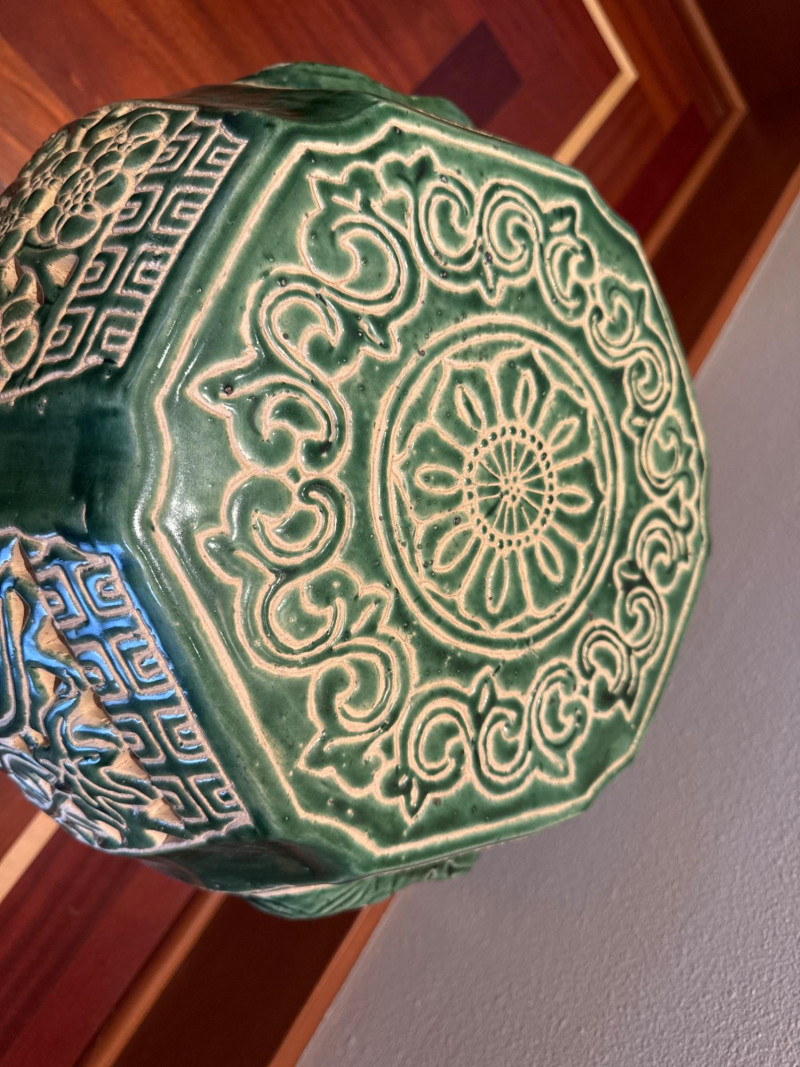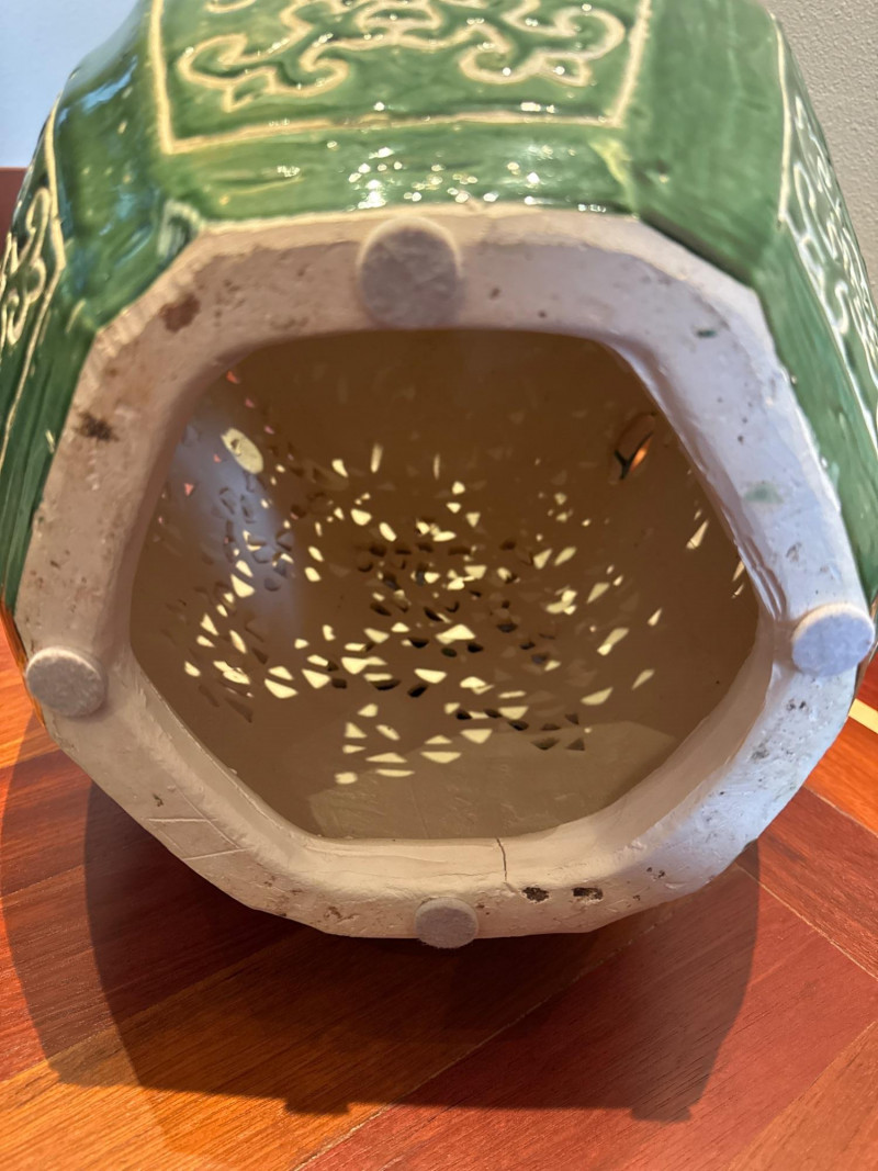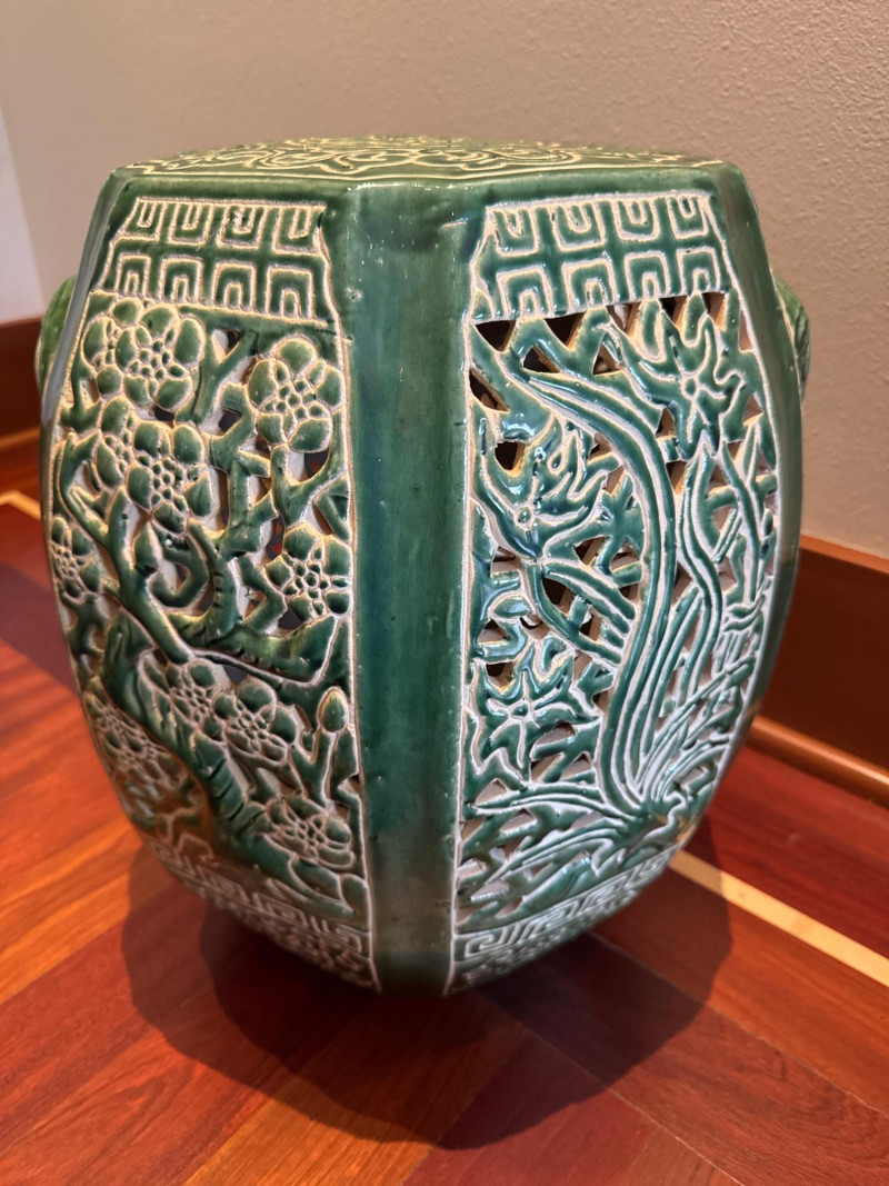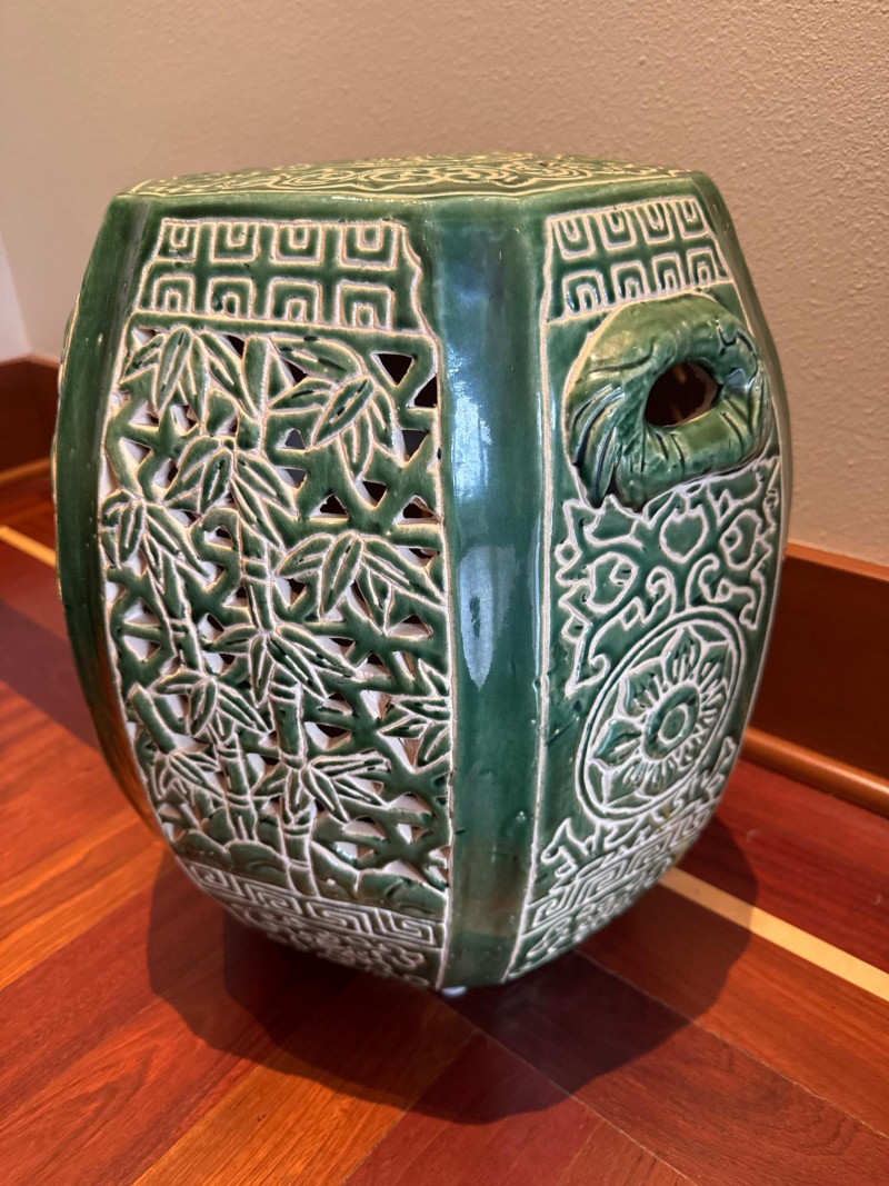 Beautiful vintage ceramic garden stool featuring a rich jade green glaze and intricate pierced (openwork) design. Decorated with classic Asian motifs including bamboo and floral patterns, this hexagonal piece makes a stunning accent indoors or outdoors.