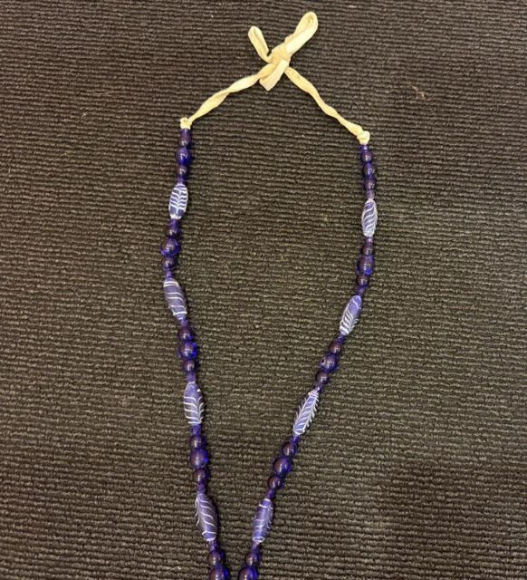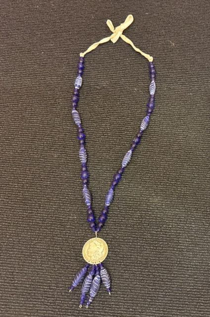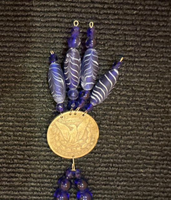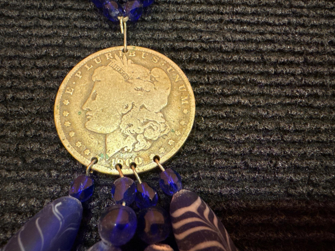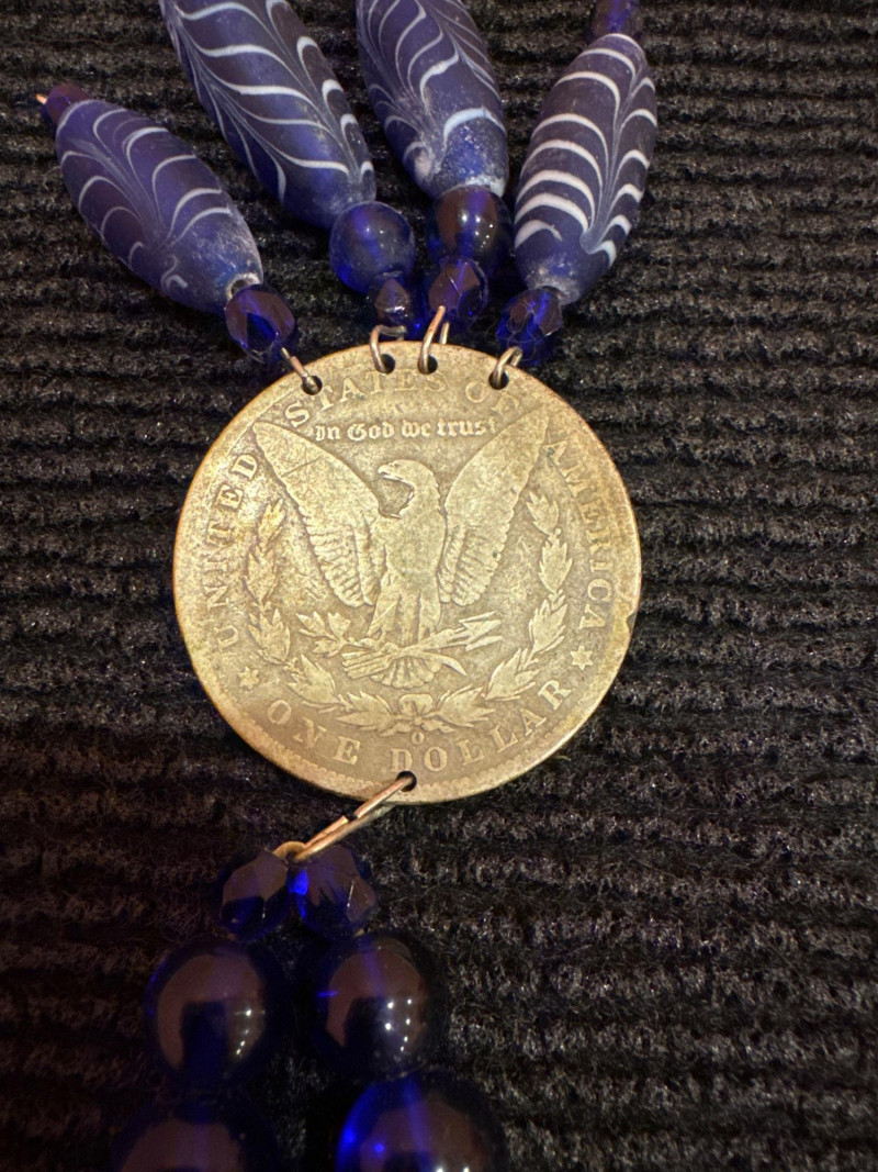 This unique artisan-made necklace features a genuine Morgan Silver Dollar (dated 1900) that has been hand-mounted as a pendant and accented with deep cobalt-blue African trade beads.