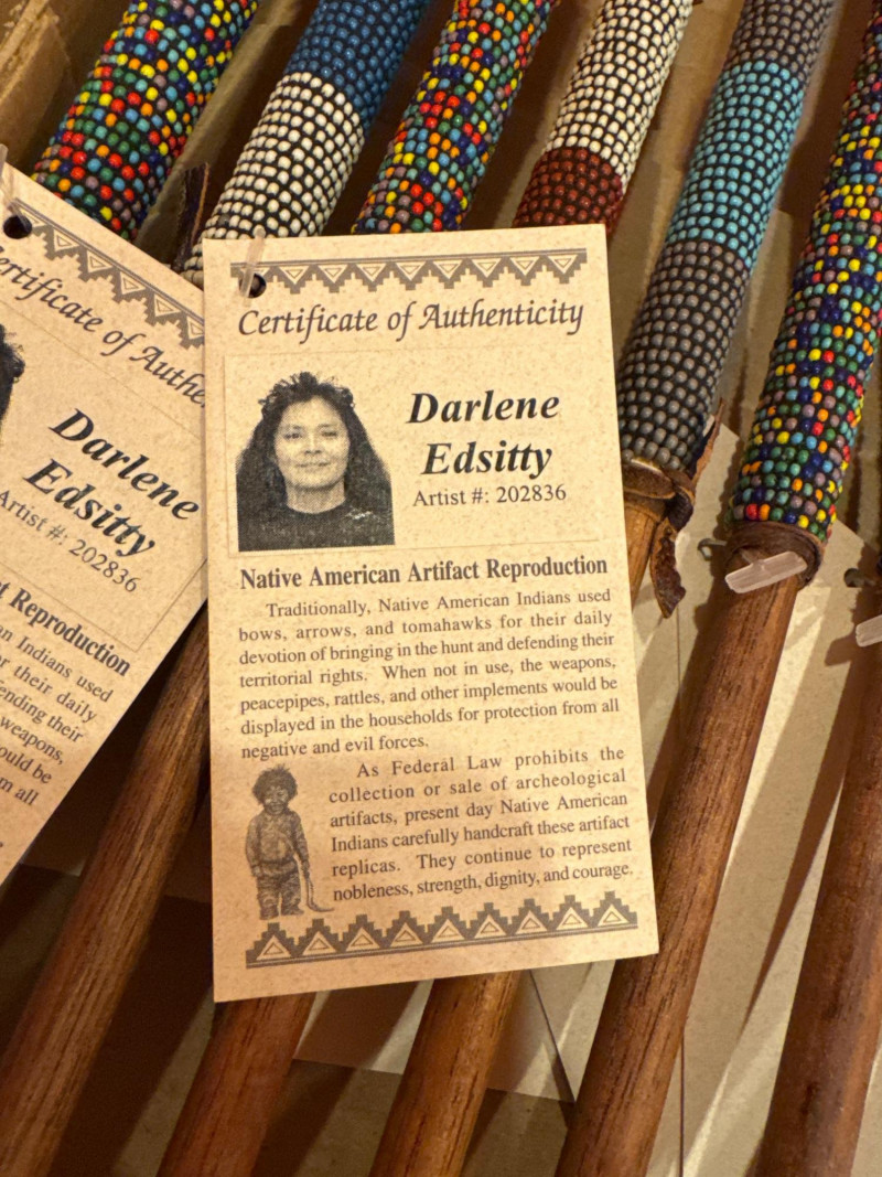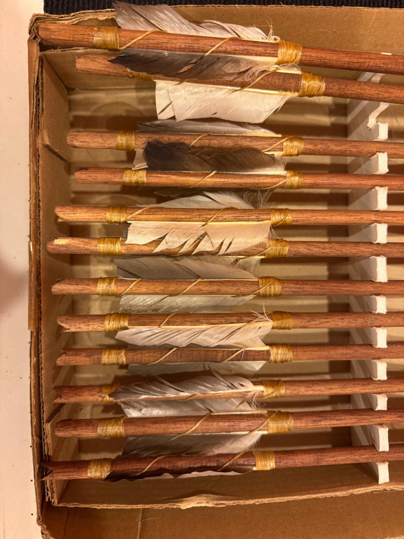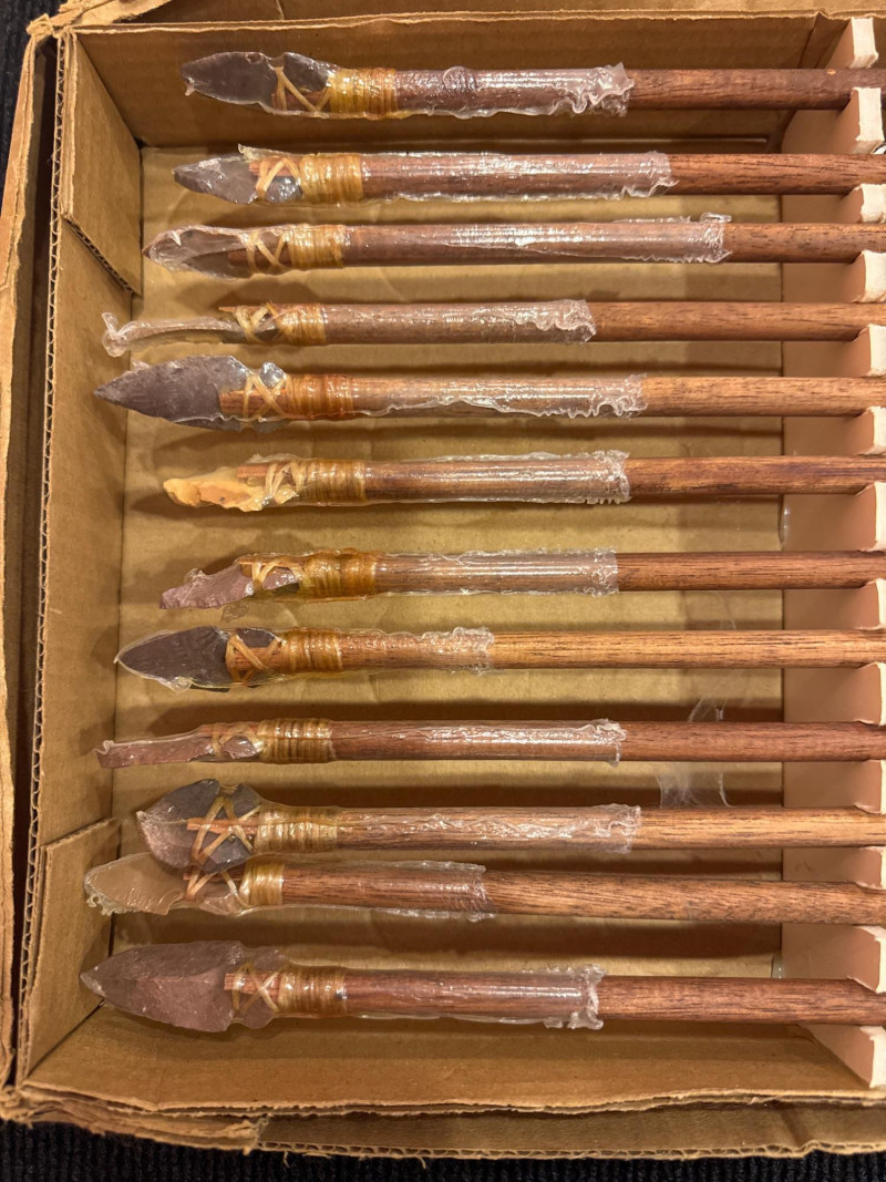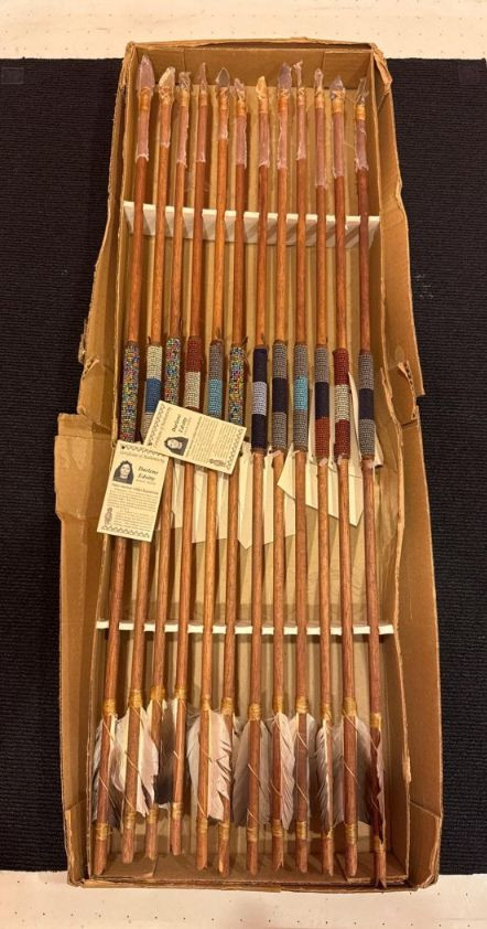 Offered here is a beautifully crafted set of reproduction Native American-style arrows created by Navajo artist Darlene Edsitty. Darlene Edsitty is known for crafting Native-inspired decorative items sold through trading posts, and Southwestern art outlets. While not tribal artifacts, her pieces are appreciated by collectors for their craftsmanship and aesthetic authenticity. Set of reproduction arrows (2) generally cost $35-$60 for the pair