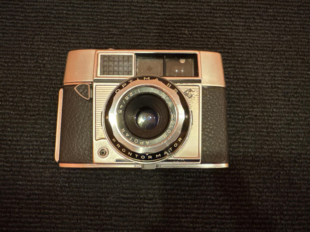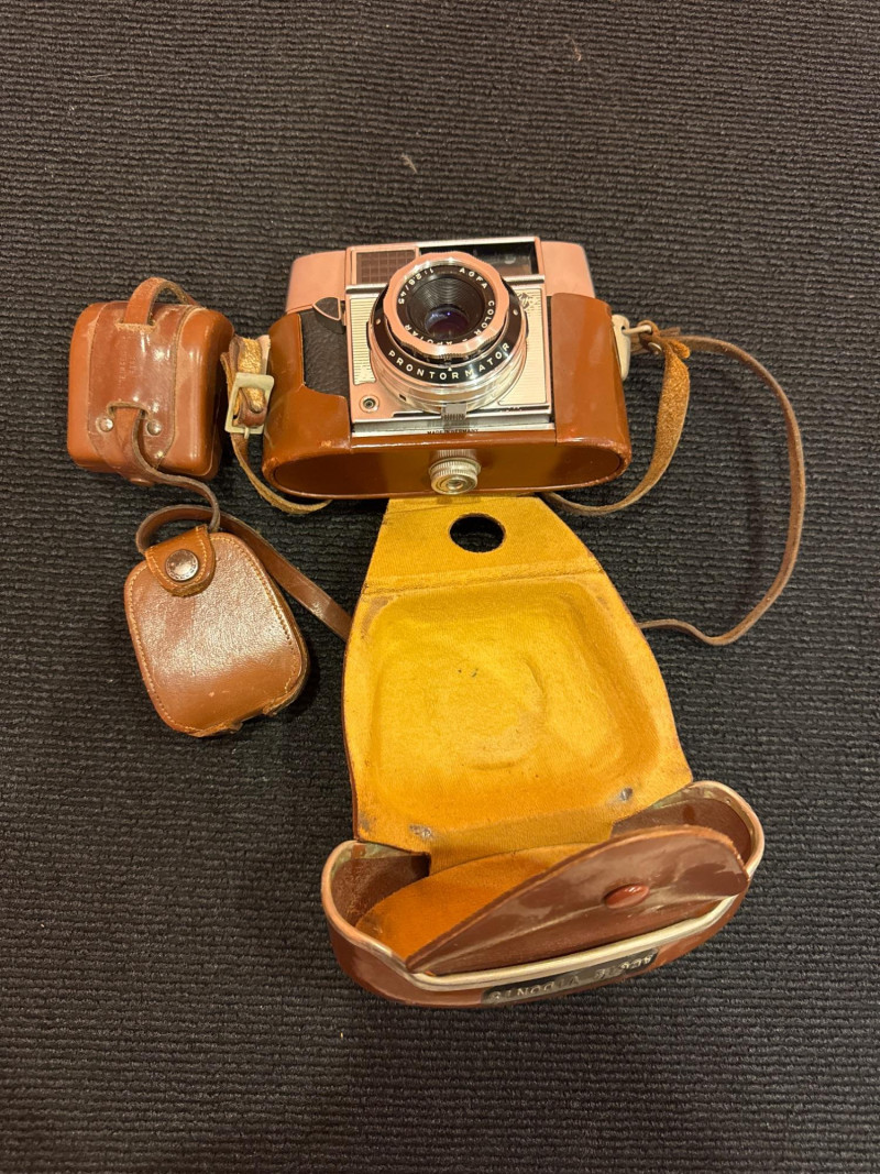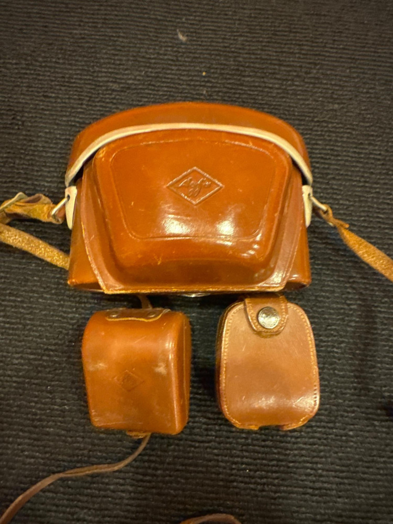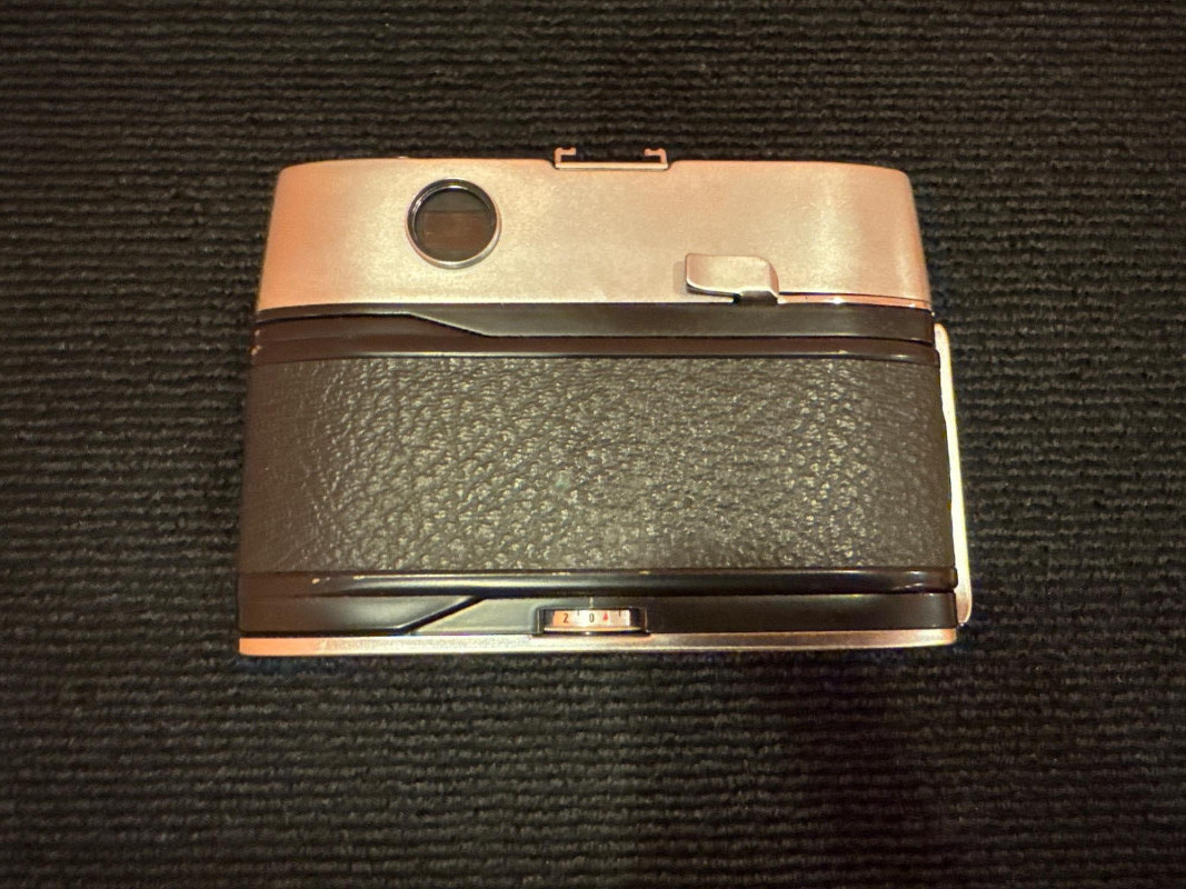 The camera in the image is a vintage , a German-made 35mm film rangefinder camera produced from 1961 to 1966. It is notable as an early camera model featuring fully automatic exposure control.