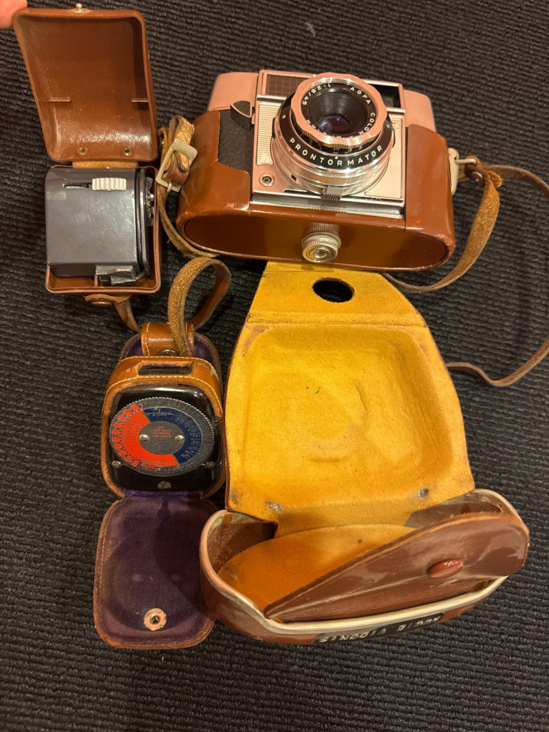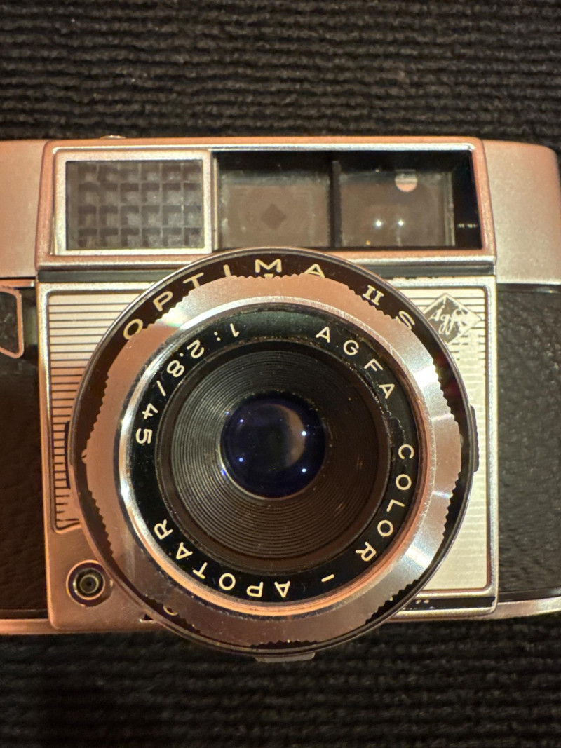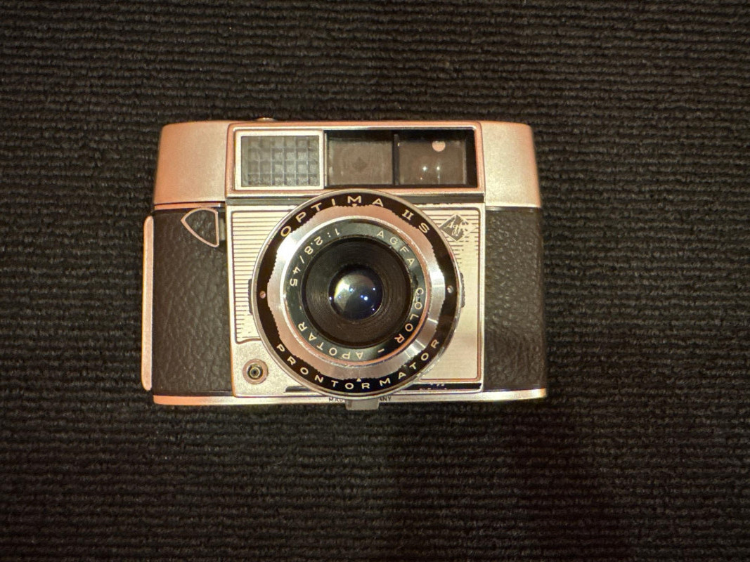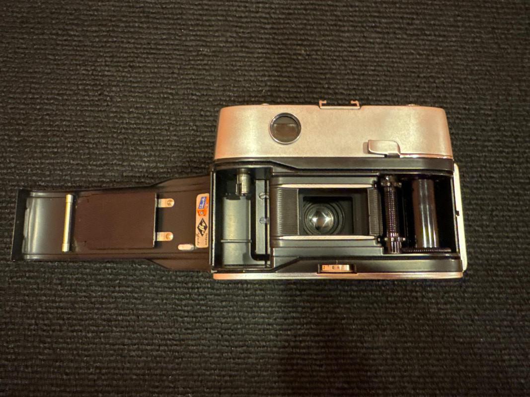 The camera in the image is a vintage , a German-made 35mm film rangefinder camera produced from 1961 to 1966. It is notable as an early camera model featuring fully automatic exposure control.