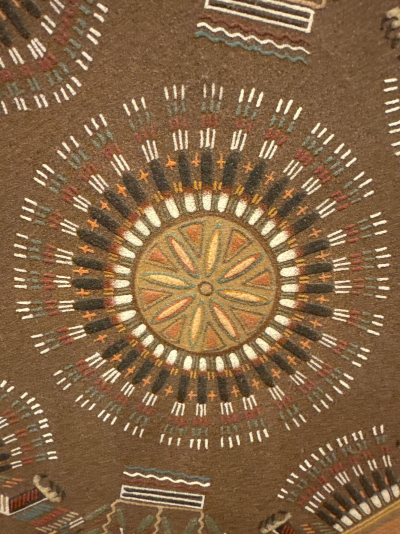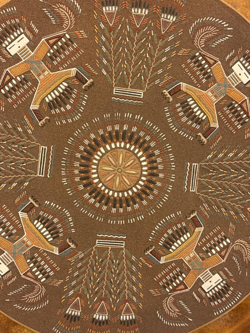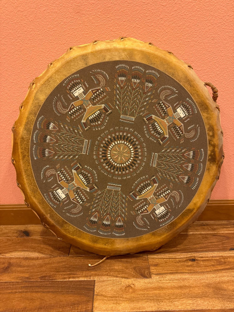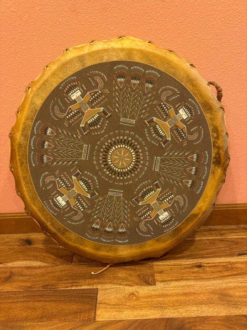 This item is a Native American-made rawhide hand drum, featuring a complex, hand-painted design that incorporates four stylized Thunderbirds.