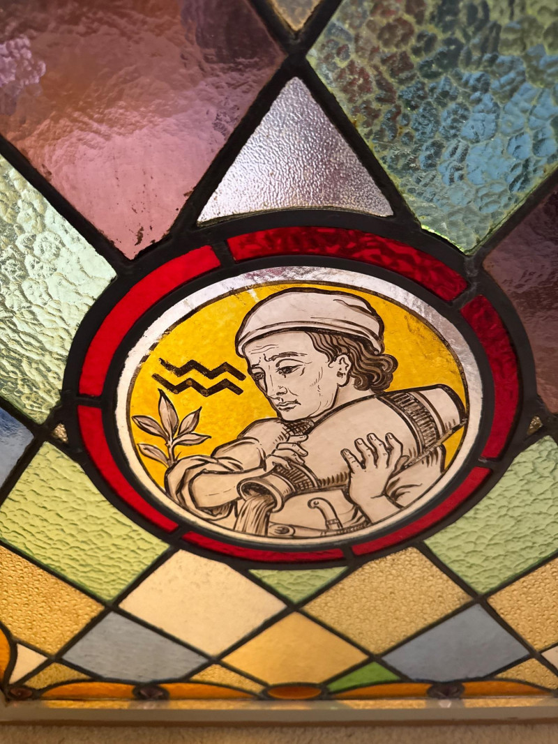 The figure of a person pouring water symbolizes the flow of energy, change, and the giving of life or knowledge associated with the Aquarius sign.