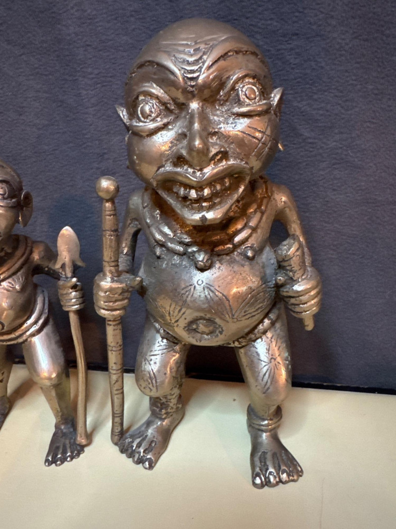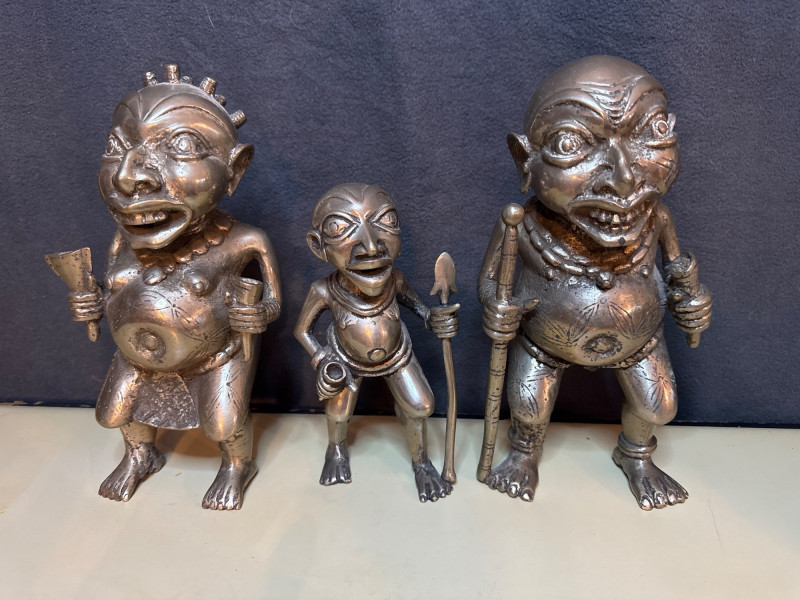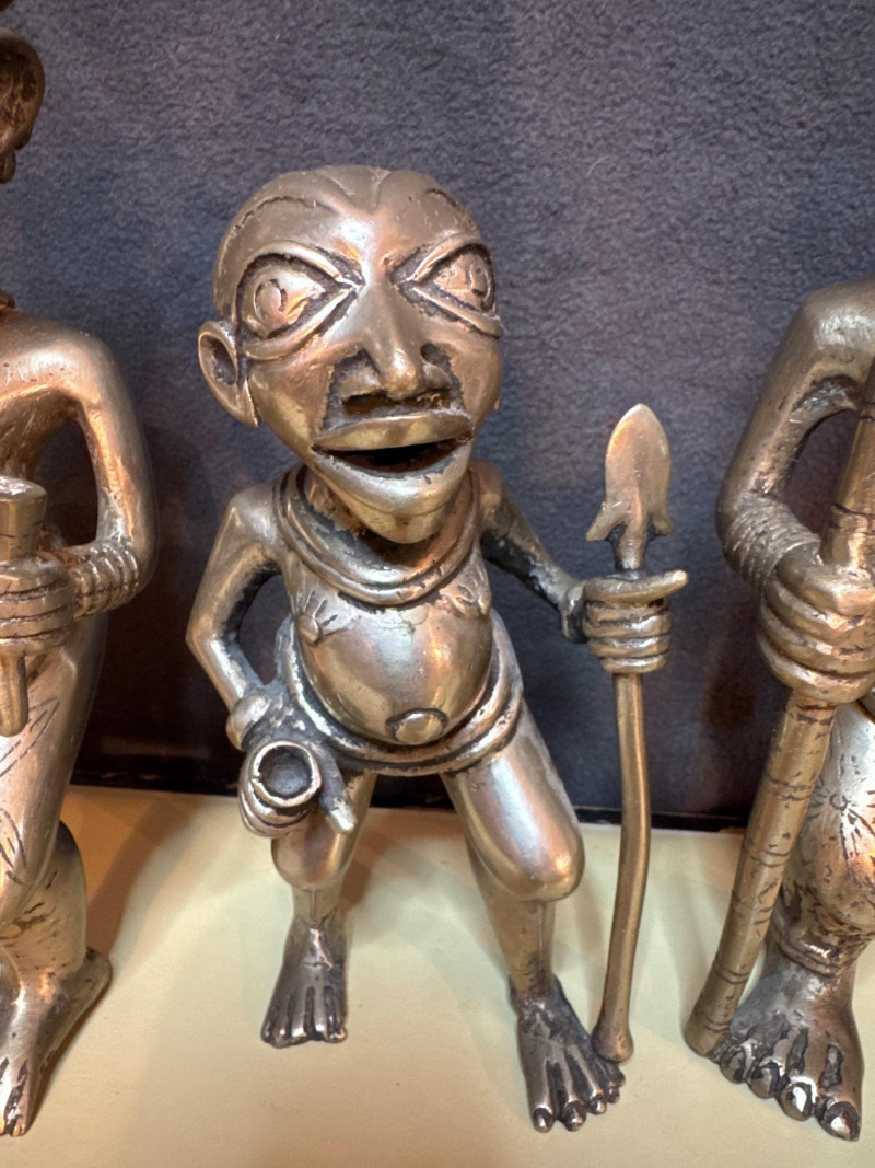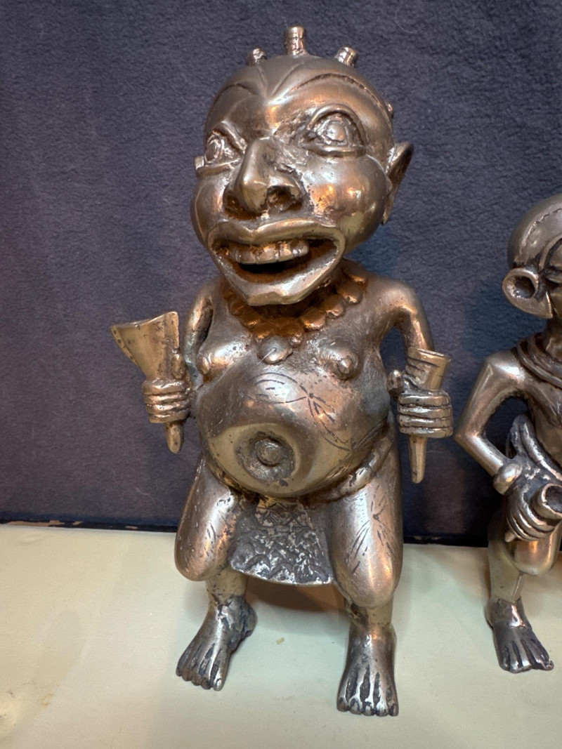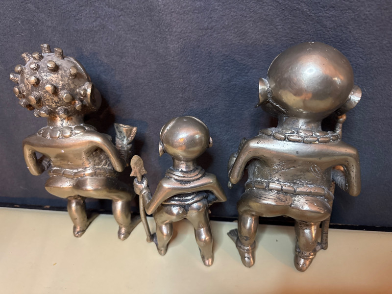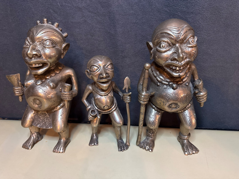 The style and subject matter are characteristic of West African art, particularly from the Edo people of the Benin Kingdom in Nigeria or the Bamum/Tikar people in Cameroon. Small statue is 7” Larger statues are 10” These are pretty heavy
