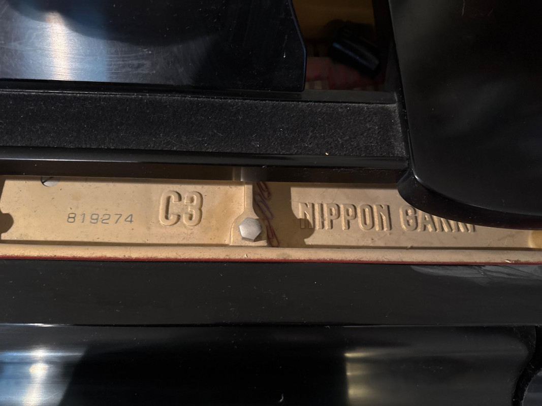 This is a Yamaha grand piano, model C3, manufactured in 1969 in Hamamatsu, Japan. The "NIPPON GAKKI" text refers to the original name of the company before it was officially changed to Yamaha Corporation in 1987. Pianos from this era are highly regarded for their quality and durability. The market value of a 1969 Yamaha C3 grand piano typically ranges from approximately $7,000 to over $11,000Brand Yamaha (Nippon Gakki) Model C3 Serial Number 819274 Year of Manufacture 1969 Location of Manufacture Hamamatsu, Japan