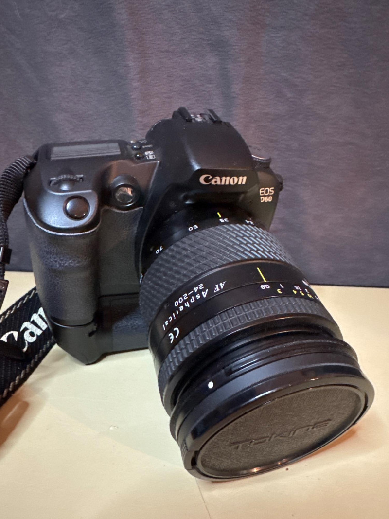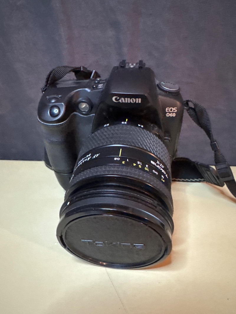 This camera is a Canon EOS D60 digital SLR, and it is fitted with a Tokina AT-X AF 24-200mm telephoto zoom lens. Many other cameras and camera accessories at the estate sale.