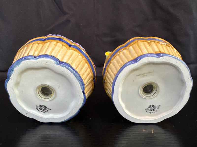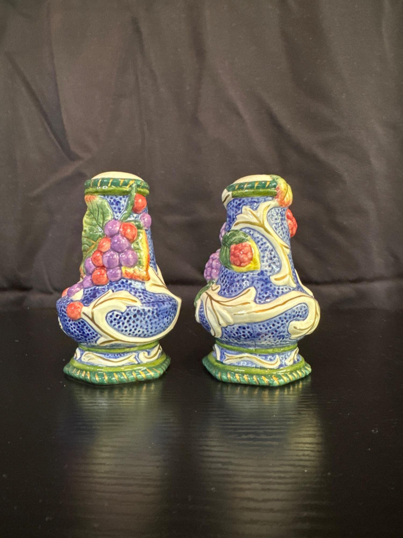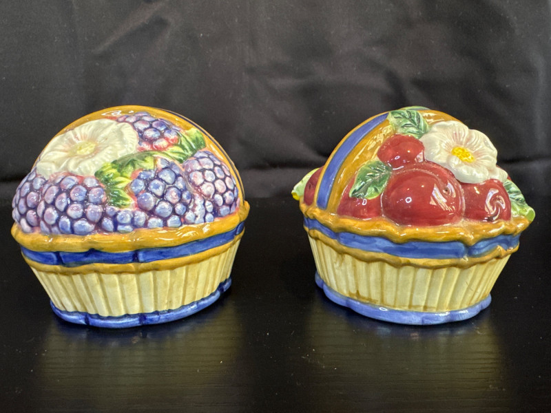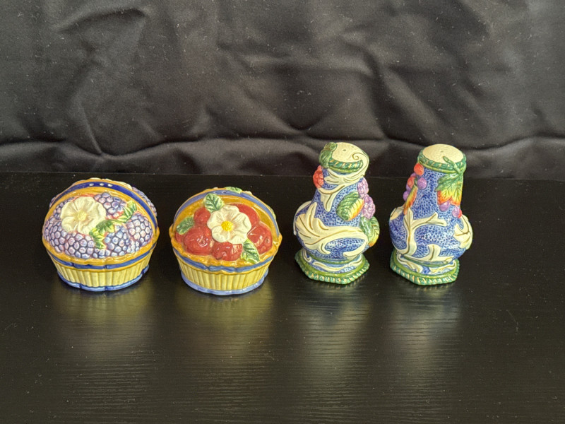 The set includes two basket-shaped shakers and two figural shakers, all hand-painted with a fruit and flower motif. This collection is retired, with pieces often dating back to the 1990s. There are multiple other shaker sets at the Estate sale.