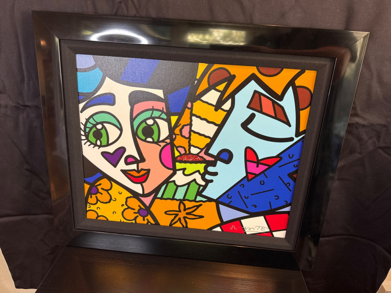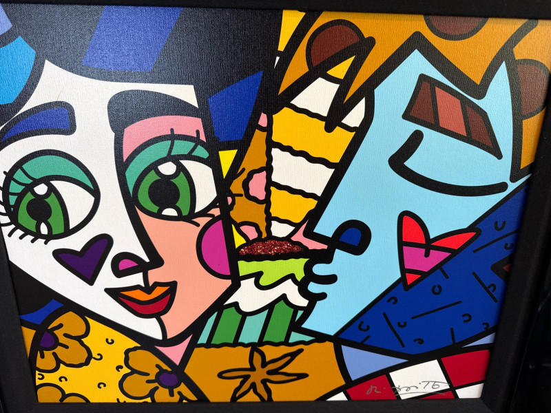 Signed "Please Sweetheart" by Brazilian artist Romero Britto 134/300 The piece exhibits Britto's signature style, which combines elements of Cubism and Pop Art with vibrant colors, bold black outlines, and playful patterns. It captures a whimsical moment of affection between a man and a woman, who are sharing a cupcake. His pieces are between $1200 - $3500 or more.