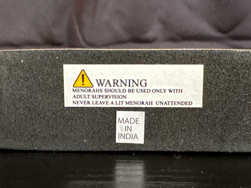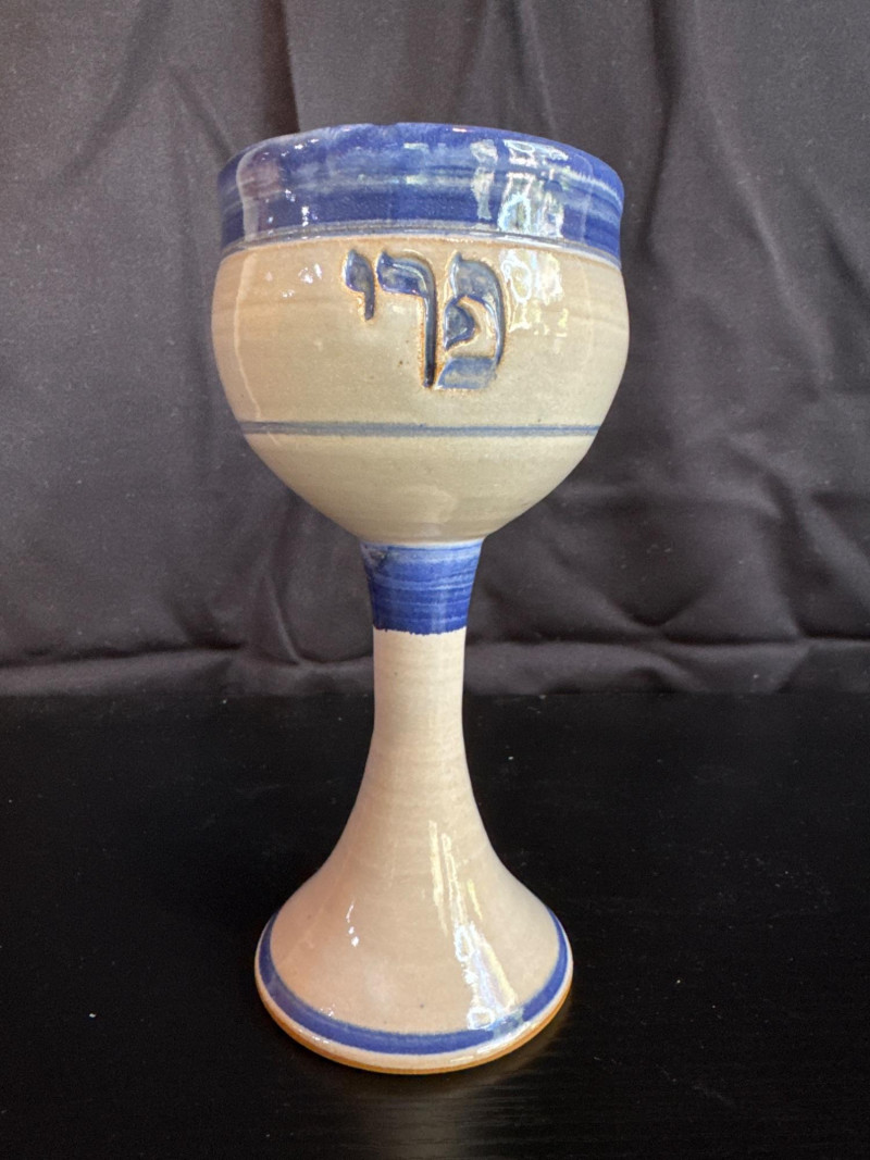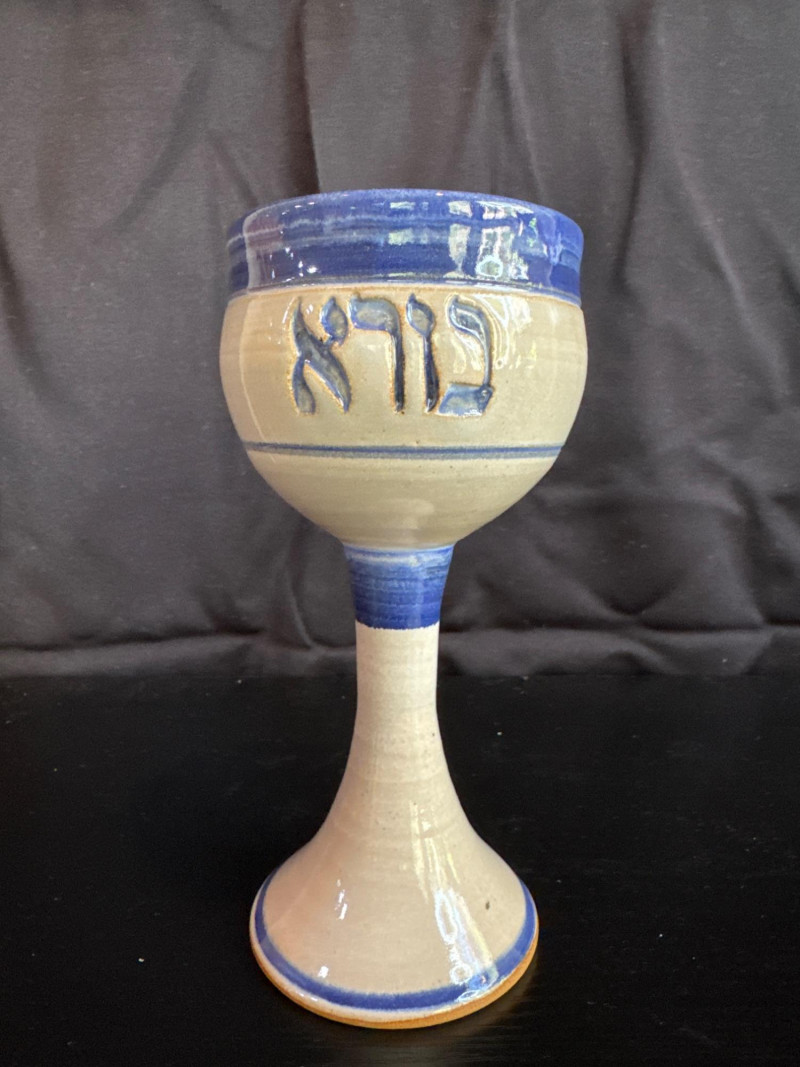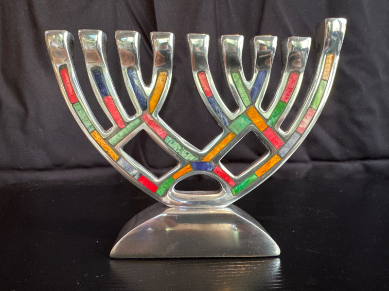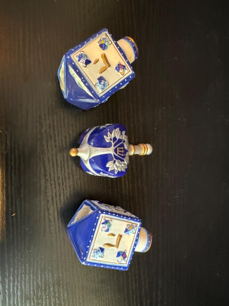 Here is a set of Judaica items for Hanukkah, specifically a menorah, a kiddush cup, and several dreidels.