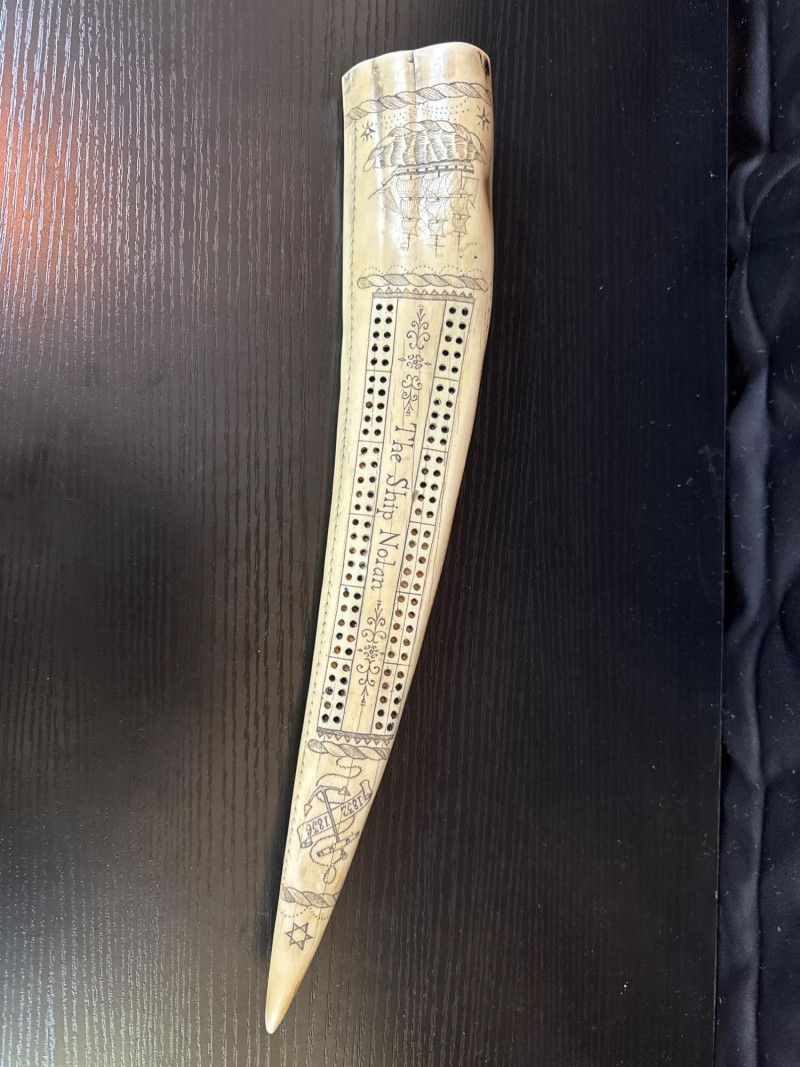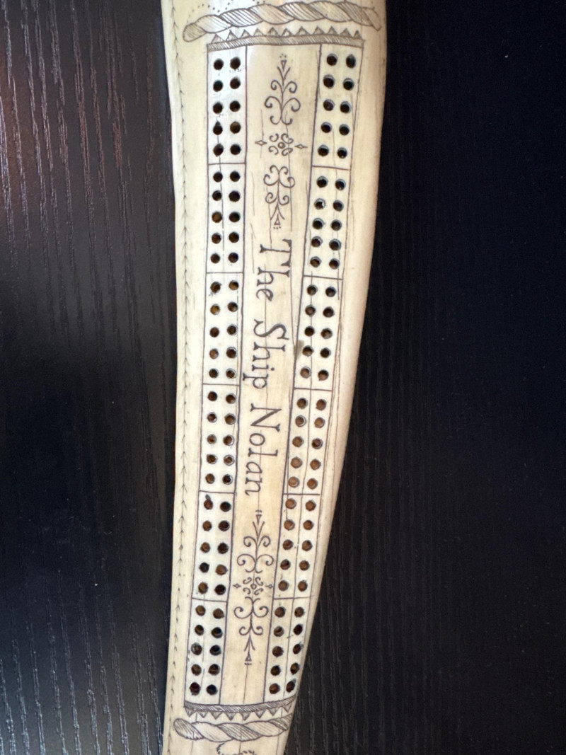 This scrimshaw-style cribbage board, often produced as a replica of historical nautical art. The text "The Ship Nolan" refers to a specific design element common in these reproductions, which often include dates like "1832-1836" and a signature "P. Aixle