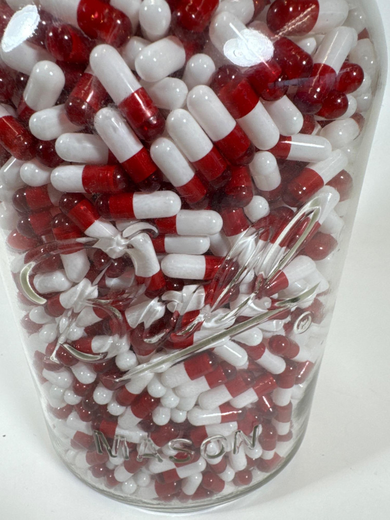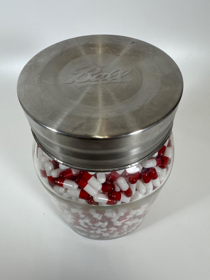 What a conversation starter, right? Large glass jar filled with prop faux pills - These pills were used in a Macklemore video.