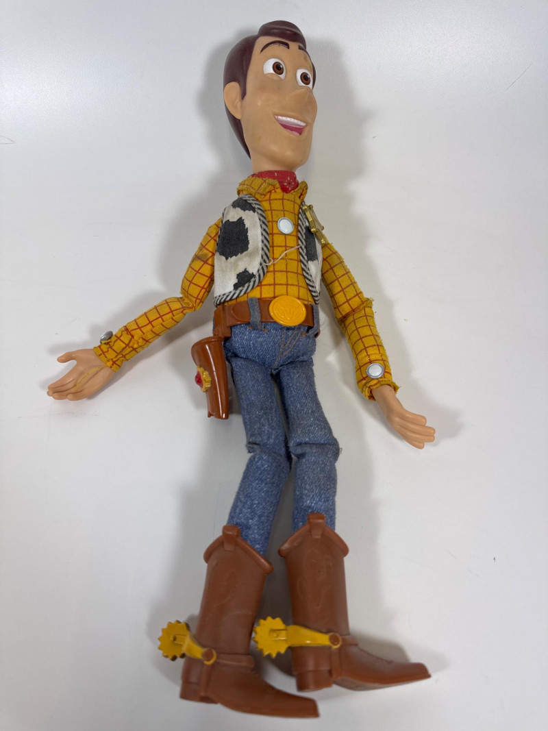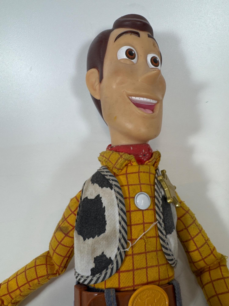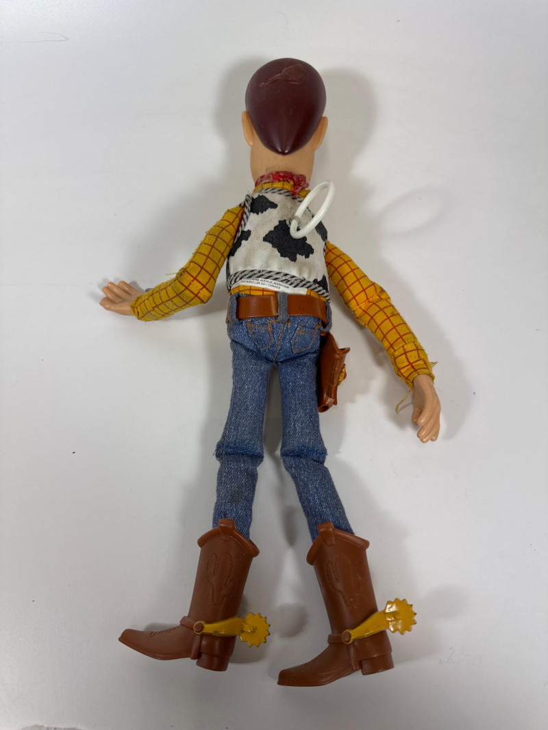 Features a traditional pull-string on his back that, when pulled, activates 10 or more familiar movie phrases like "Hey, Howdy, Hey!" and "You've Got a Friend in Me".