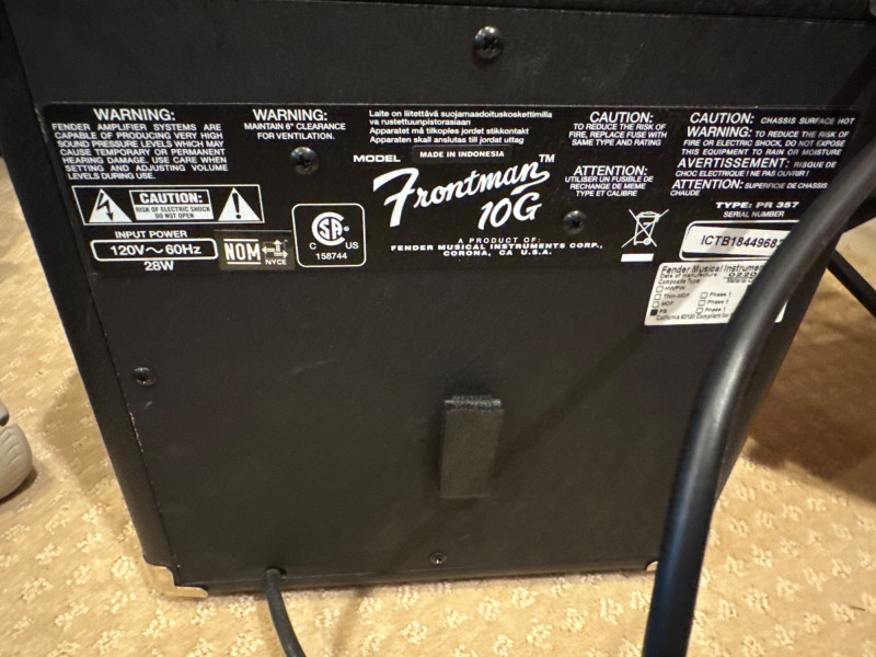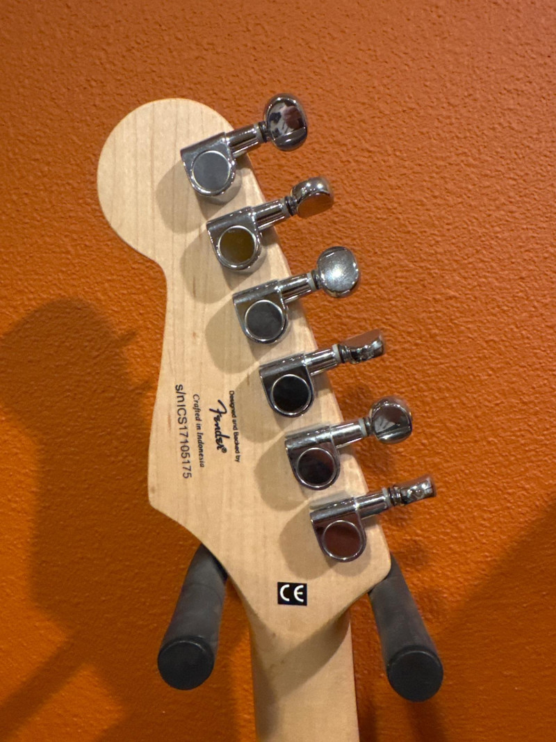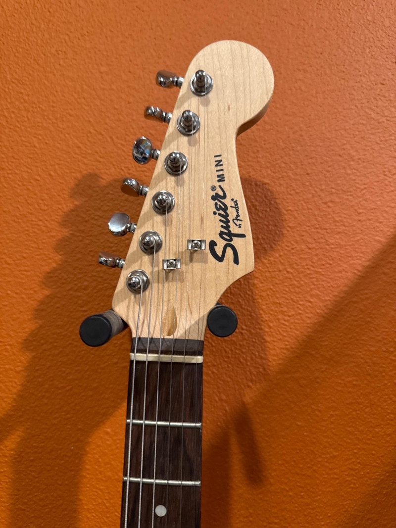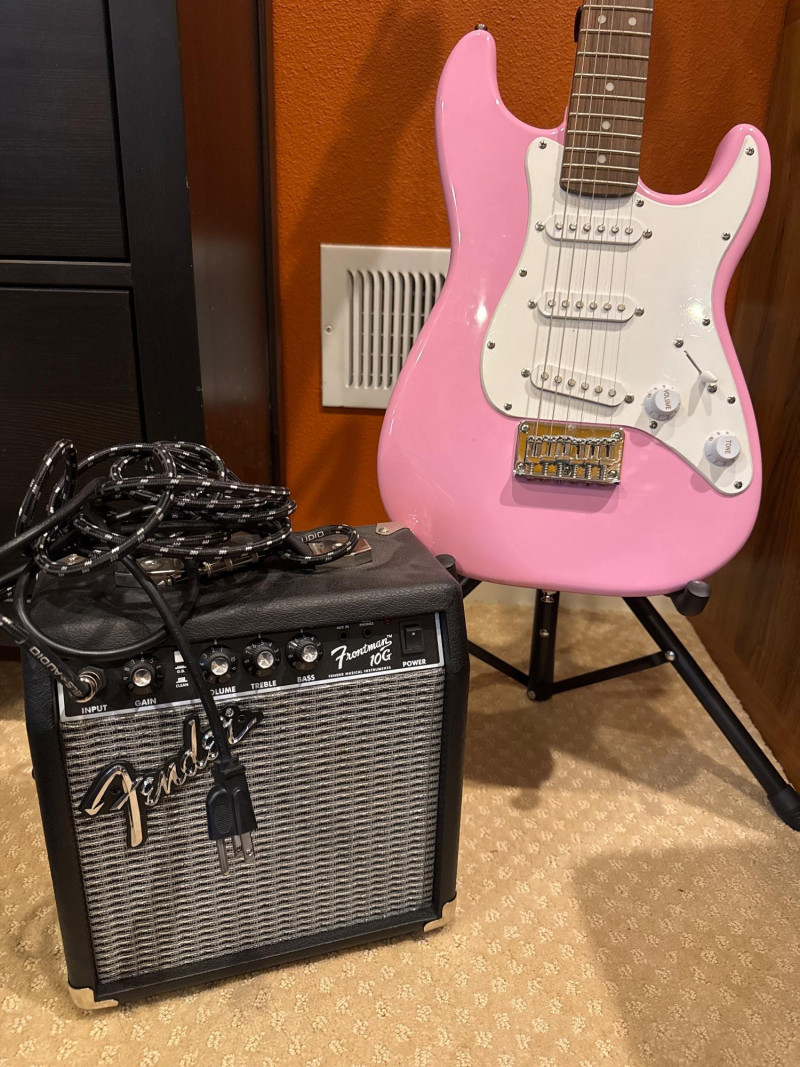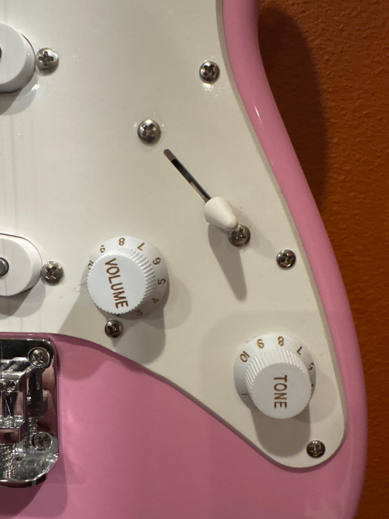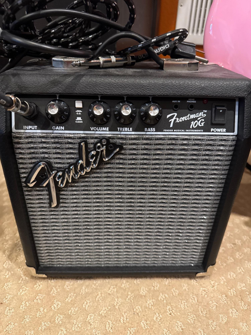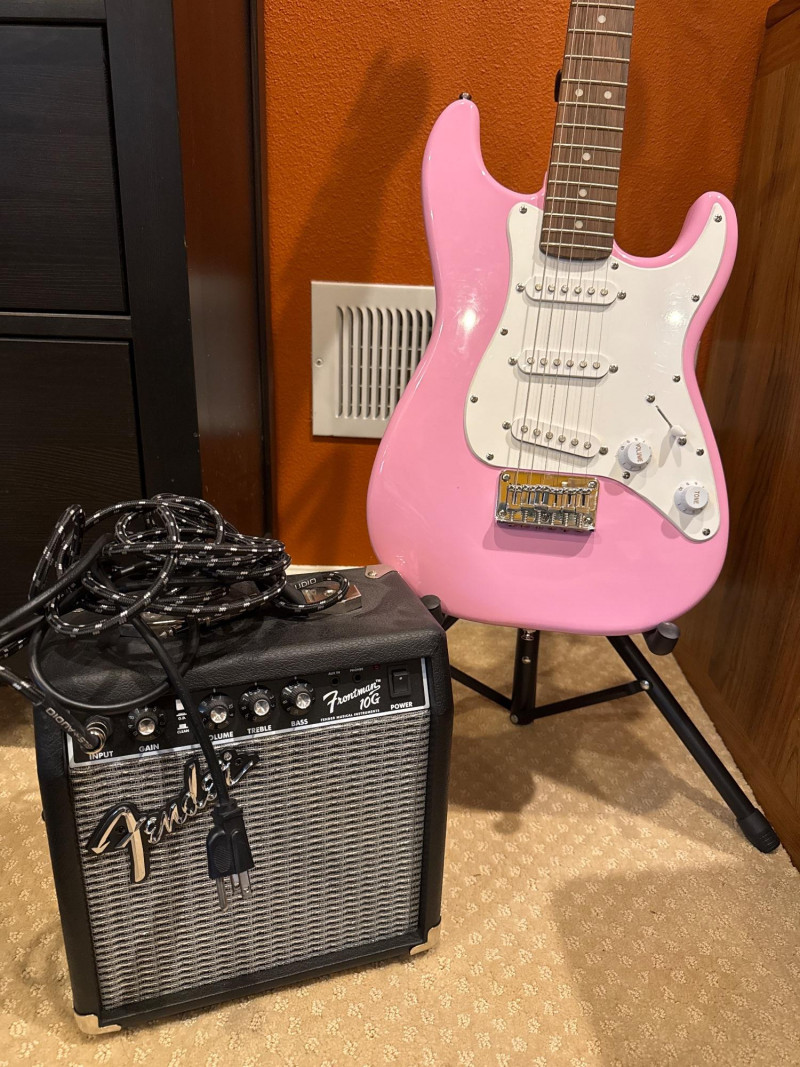 STAND NOT INCLUDED IN THE AUCTION Key Specifications Scale Length: It has a 22.75" scale length, which is the defining characteristic of its 3/4 size, making it ideal for beginners, younger players (ages 6 to 12), or those with smaller hands. Hand Orientation: It is a right-handed model Color: The pink finish is known as Shell Pink. Body & Neck: It features a lightweight poplar body and a comfortable "C"-shaped maple neck with an Indian laurel or maple fingerboard. Electronics: The guitar is equipped with three standard single-coil pickups and a 5-way selector switch, offering versatile Stratocaster tones. Also included is a Fender Frontman 10G solid-state electric guitar amplifier, a popular 10-watt practice amp known for its classic Fender blackface design and value price.