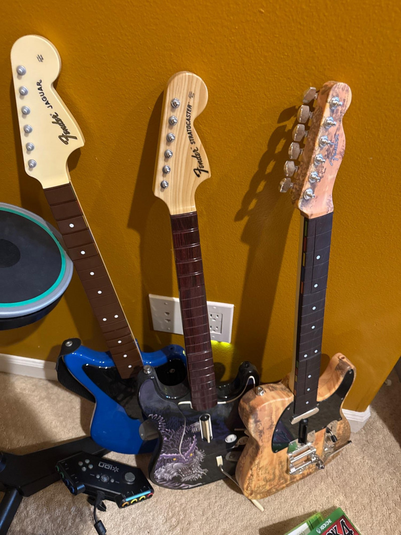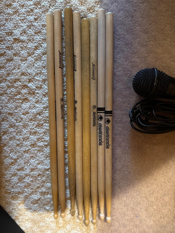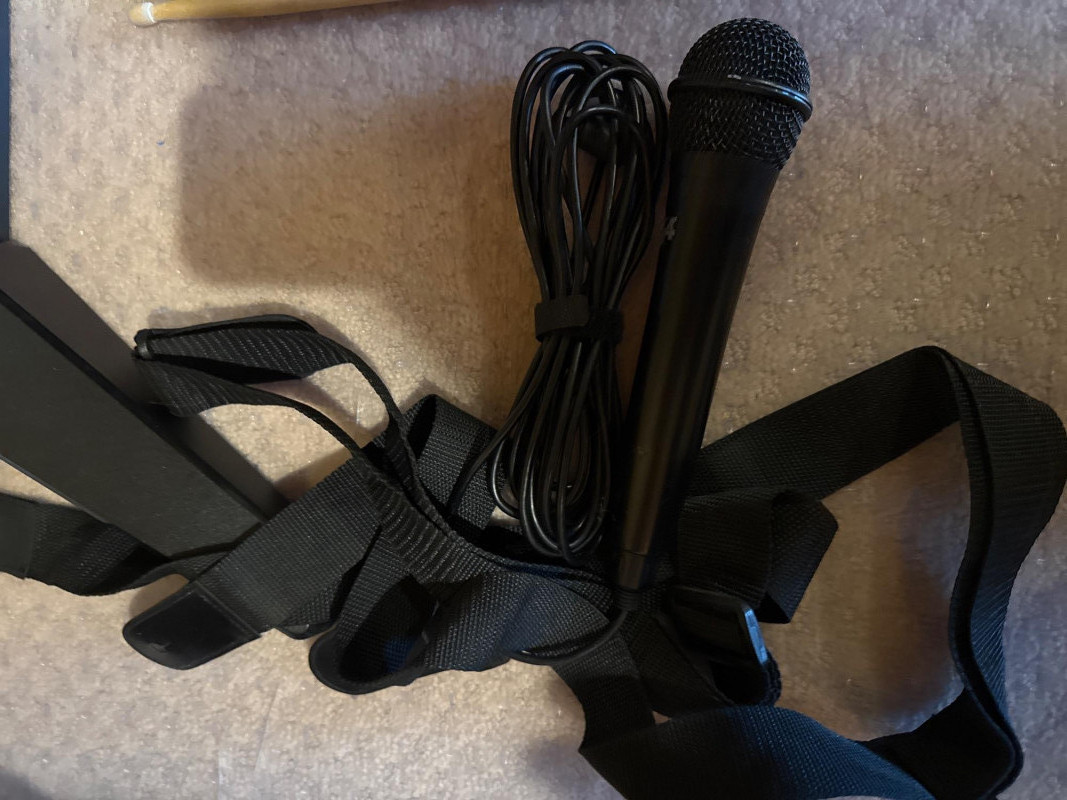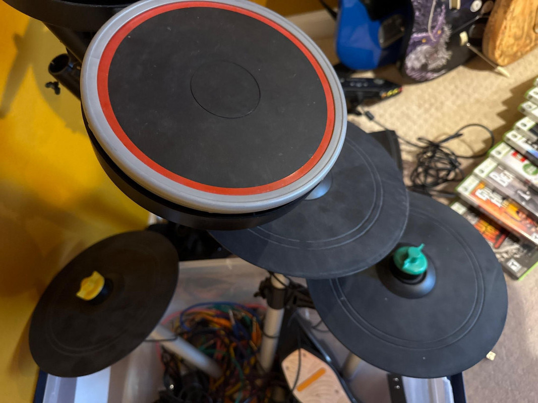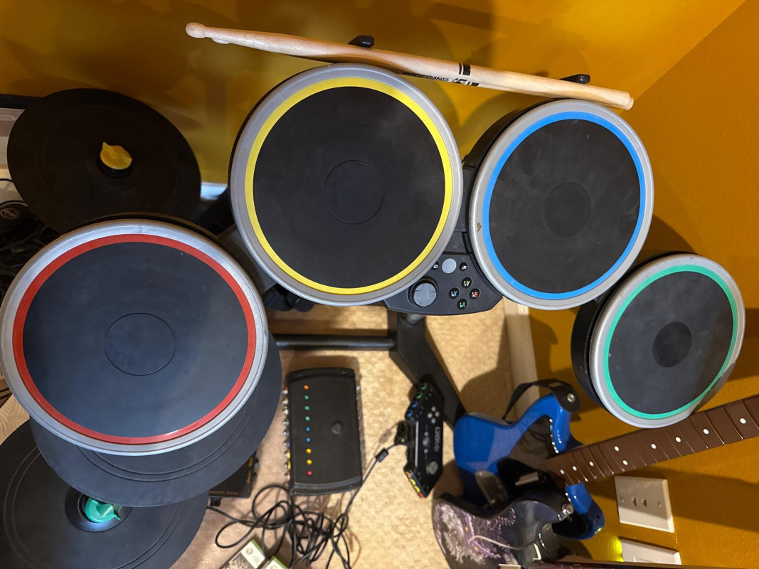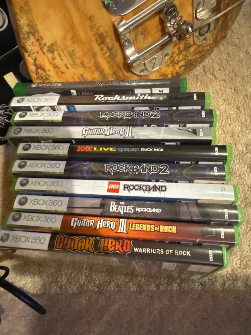 Large Rock Band Xbox Lot - - Drums Set with Cymbals - 3 Guitars - Kick Box - Microphones - Drum Sticks - 9 Xbox 360 Games and 1 Xbox One Game - Foot Pedal - and More