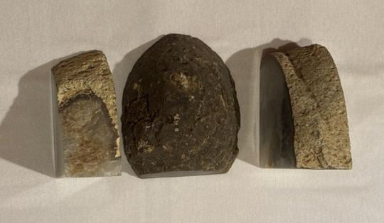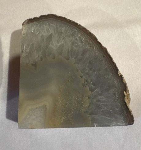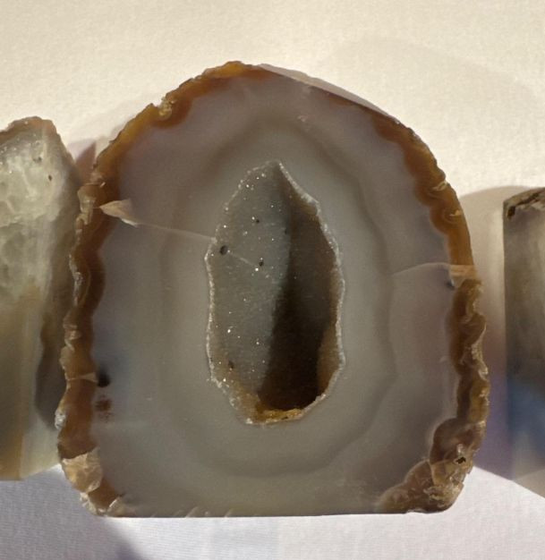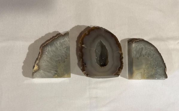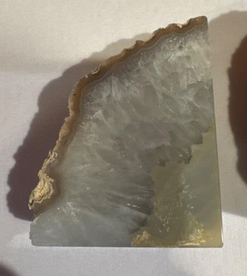 These are natural rock formations that have been cut and polished on one side to reveal their beautiful banded interior and crystal cavity (known as a druzy center). 3.5” tall - Smaller bookend 4” Tall - 3.5” Wide - Druzy Center Cut