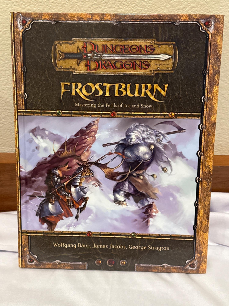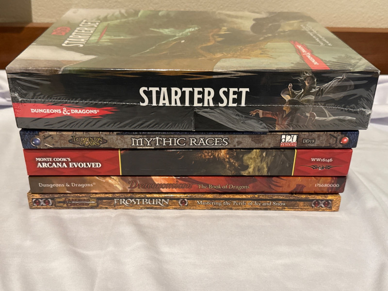Dungeons & Dragons Starter Set (5E)The top item is the Dungeons & Dragons Starter Set, a modern 5th Edition product that appears to be the popular "Lost Mine of Phandelver" version. Mythic Races: This is a 3.0/3.5 edition sourcebook from the Legends & Lairs line by Fantasy Flight Games, which offers a definitive source for new and exotic character races and cultures.Value (Used/New): ~$20 - $50+ USD Monte Cook's Arcana Evolved: This is a "Director's Cut" variant Player's Handbook for the 3rd Edition d20 system, which includes alternate classes, races, spells, and a complete rules system set in the Diamond Throne campaign world.Value (Used/New): ~$30 - $90+ USD Dungeons & Dragons The Book of Dragons: This appears to be a modern 5th Edition book that is a definitive illustrated guide to dragon lore, types, and characters in the D&D universe, written from the perspectives of Tiamat and Bahamut.Value ( New): ~$22 - $40 USD Frostburn: Mastering the Perils of Ice and Snow: A 3.5 Edition sourcebook that provides extensive rules for running D&D campaigns in arctic and cold-weather environments, including environmental hazards, specific spells, magic items, prestige classes, and monsters.Value (Used/New): ~$20 - $90+ USD (can reach much higher for specific conditions)